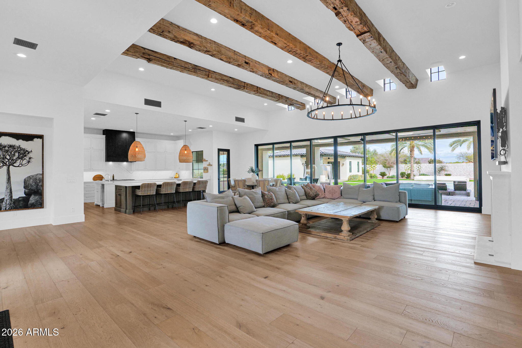 Welcome to an extraordinary custom estate nestled on a 1.13-acre cul-de-sac lot in the prestigious Legacy community of Mesa. Step inside to soaring 14-foot ceilings with dramatic wood beams, two gas fireplaces, and expansive 30-foot sliding glass doors that create seamless indoor-outdoor living.