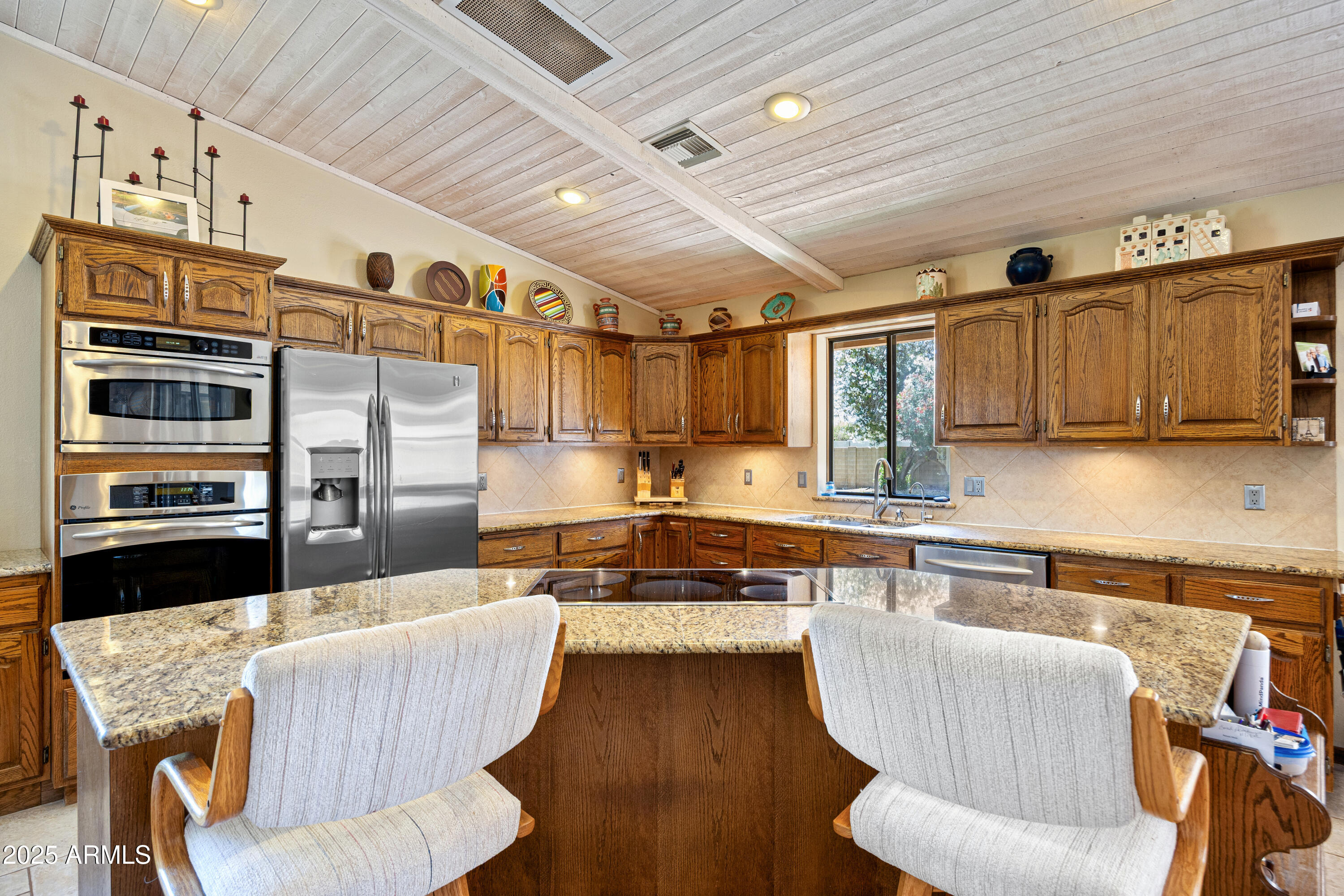 Inside, enjoy vaulted ceilings, skylights, tile flooring, and a spacious kitchen with oak cabinets, granite countertops, large island, and high-end appliances including built-in microwave, refrigerator, electric cooktop, dishwasher, and reverse osmosis system. The cozy fireplace in the living room adds warmth and charm.