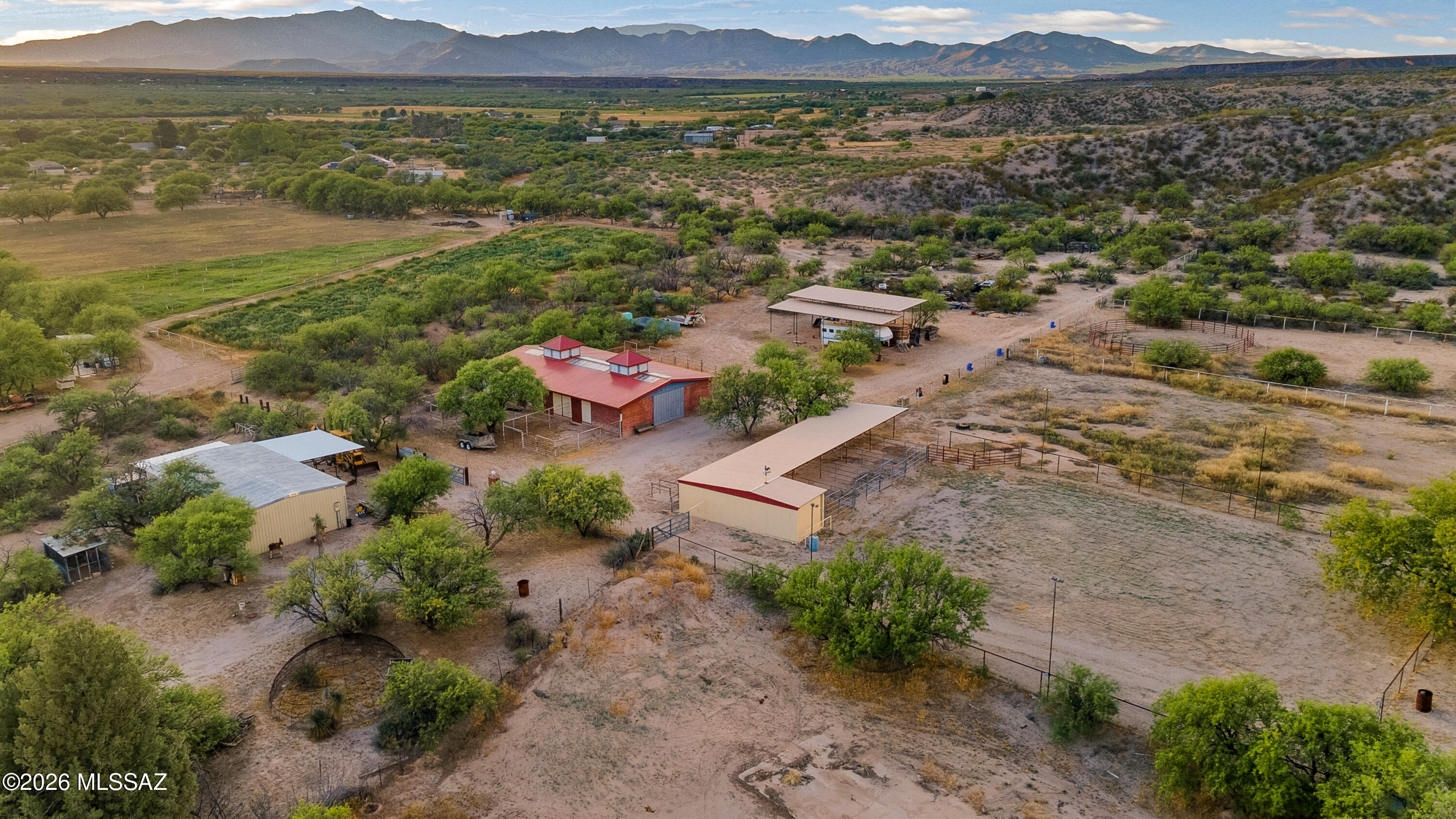 Welcome to an extraordinary opportunity in the serene countryside of Pomerene Park in Benson, Arizona-where wide-open skies, peaceful desert landscapes, and endless potential come together on this remarkable 8.33-acre estate. This rare offering is truly a one-of-a-kind property designed for those seeking space, versatility, and the ultimate rural lifestyle, whether for full-time living, equestrian pursuits, or a private weekend retreat. As you arrive, you're immediately greeted by a long, private approach enhanced by a substantial straw bale wall with a stucco finsh along Pomerene Road-fullypaved-providing both privacy and a sense of arrival. Beyond the entrance,