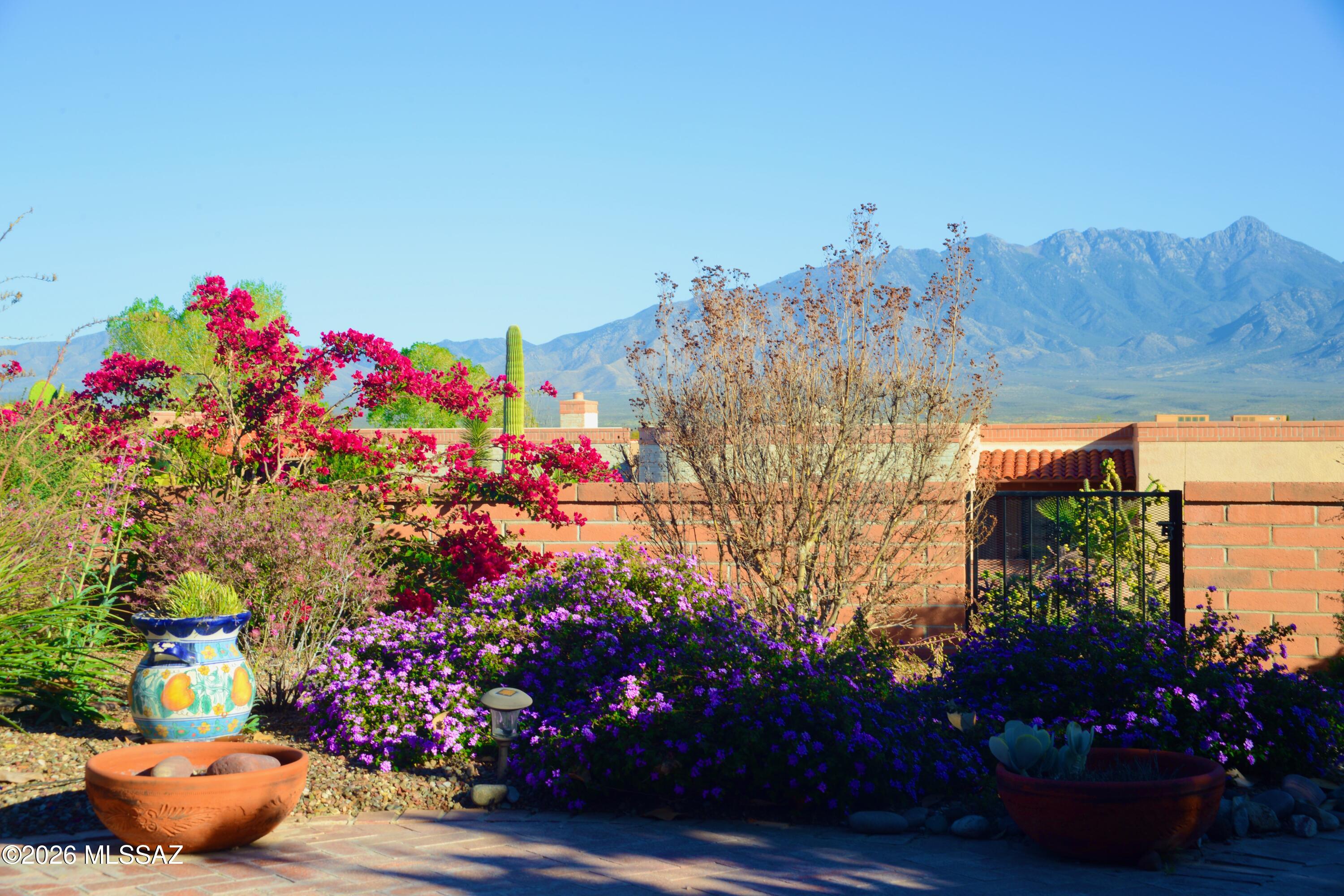 Located in the desirable 55+ community of Canoa Seca Estates II, this 2,050 sq ft Miramar model offers 2 BD, 2 BA + den in a quiet, private setting. Gorgeous, sweeping, mountain views create a beautiful daily backdrop for quiet sunsets and gatherings alike. Designed for easy indoor-outdoor living, the home features a wraparound covered patio surrounded by mature landscaping that enhances the serene private oasis. Inside, all-tile flooring & neutral palette provide a bright, cohesive feel, while a traditional beehive fireplace built in mesquite shelving adds warmth & Southwest charm. Guest parking is steps away, with nearby GVR centers rounds out this perfect location. Newer HVAC