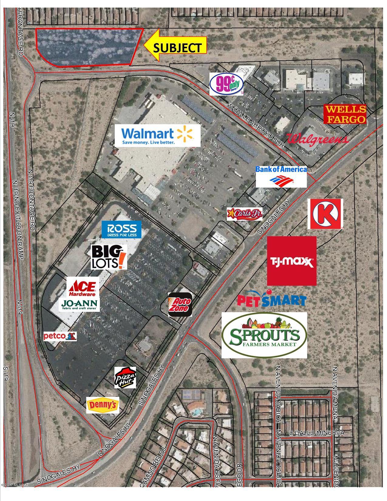 This property is directly behind the Walmart Super Center in the booming town of Sahuarita. It is zoned CB-2 which would enable a number of commercial uses. It is on the NE corner of Calle Arroyo Sur and the east frontage road. Calle Arroyo Sur has a signalized intersection with the Nogales Highway. The land is affected by wash and overhead power line. But at this price it represents a great value with many uses. OWNER AGENT.