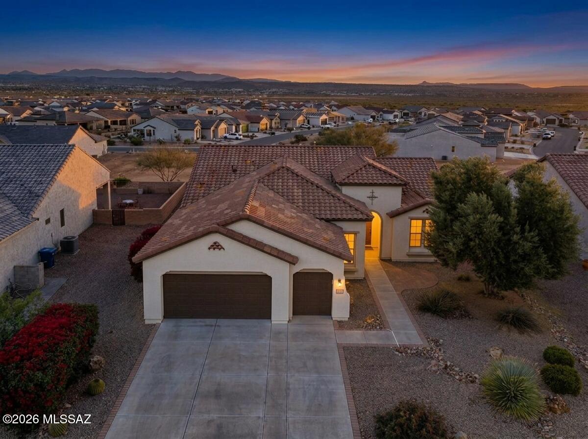 Refreshed & ready for the new owners! Look at this 2012 extended Medina model, elevated lot w/ mountain views! Spacious & stylish w/ coffered ceiling, a bank of windows w/ 12' wall of sliding doors w/ center opening. 20'' floor tiles, 4ft garage extension w/ golf cart garage. The owners suite has a bay window extension, granite counters at the double sink, soaking tub & large shower. The kitchen has upgraded cherry cabinets w/ wide crown molding, under cabinet task lighting, slab granite, pull out shelves, planning desk and center island. The GE appliance package includes the gas cooktop. 2 full bathrooms & a powder bath for company, den or office and an inviting entry! A great place to call home! New exterior paint 2026, new 1/2 re-roof on the front 2025, new faucets 2026!