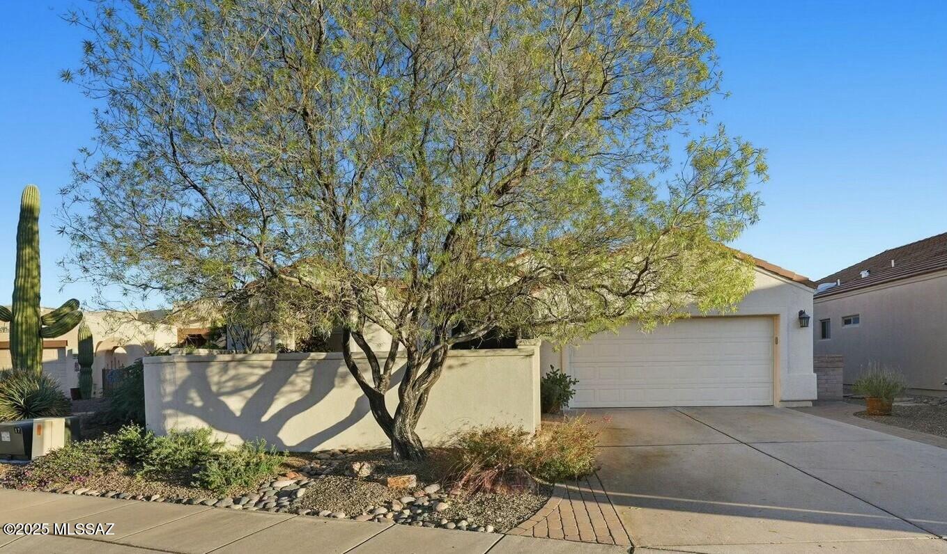 This beautiful home is located in the gated Greens at Santa Rita Springs. Ideally situated near golf courses, shopping, recreation centers, and grocery stores. Impeccably maintained, it boasts numerous updates and improvements, including fresh interior paint, new irrigation, professional landscaping, and a pergola with a fan and lights, among other thoughtful touches. The front courtyard provides a serene retreat with a fountain and privacy wall, perfect for relaxing or entertaining. Inside, the home feels warm and inviting, featuring vaulted ceilings, a double-sided gas fireplace serving both the formal and informal living areas, and large windows that fill the space with natural light. The chef's kitchen is a dream, with painted soft-close cabinets, new granite countertops, a custom
