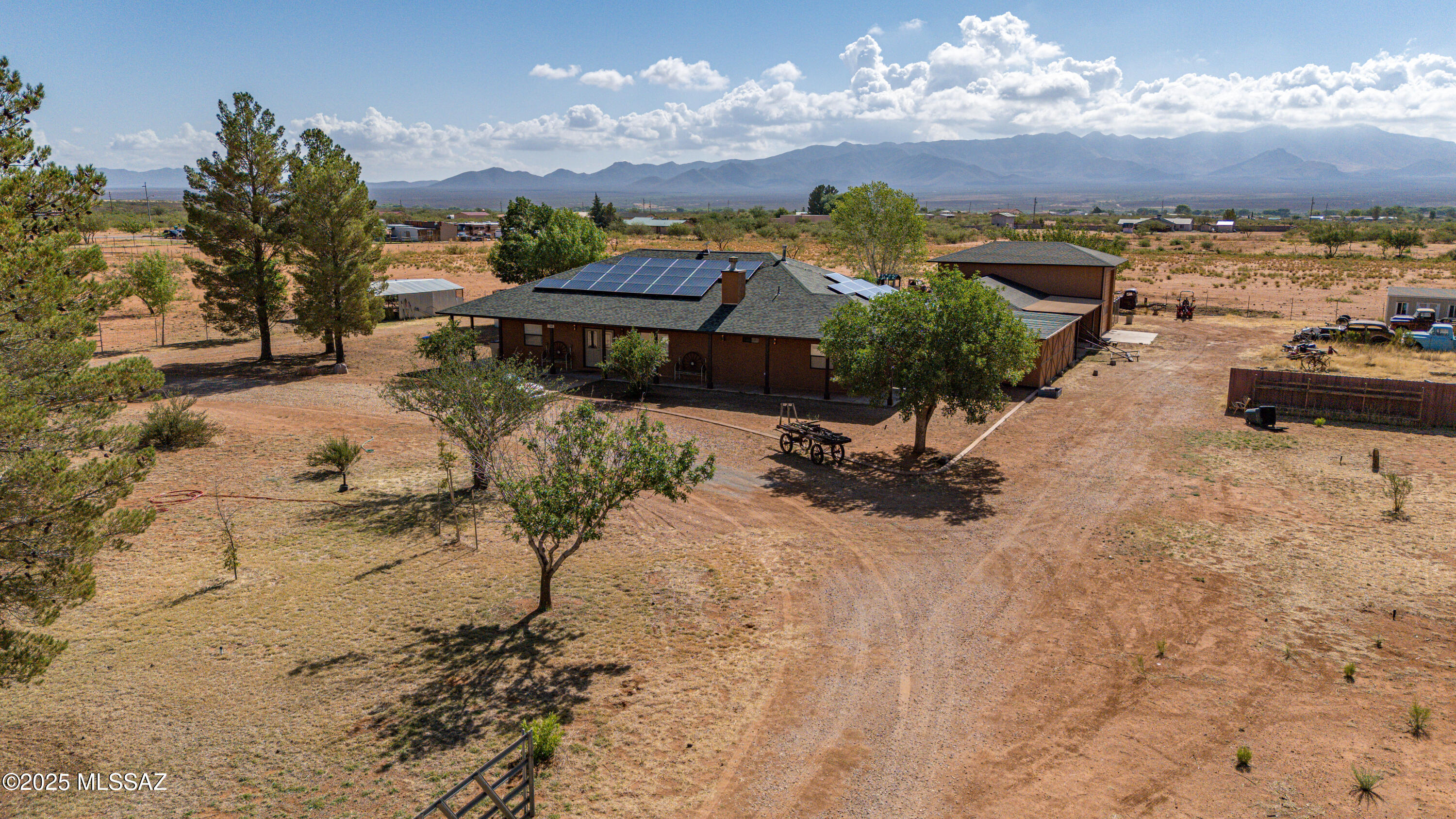 Discover the perfect blend of space, privacy, and convenience on this fully fenced 8.4-acre property with sweeping mountain views. Ideal for those who value peace, self-sufficiency, and room to grow, this property checks all the boxes.The 3-bedroom, 2.5 bathroom home features an additional den, ideal for a home office or guest space. The kitchen boasts granite countertops, ample cabinetry, perfect for entertaining or daily living. Car enthusiasts, hobbyists, and RV owners will love the incredible garage space: a 5.5-car garage, a dedicated RV garage with full hookups, plus a separate workshop for tools, projects, or storage. Solar power and enjoy the freedom of your own private well. A newer roof. Step outside to enjoy your own private oasis?featuring fruit trees, a greenhouse.
