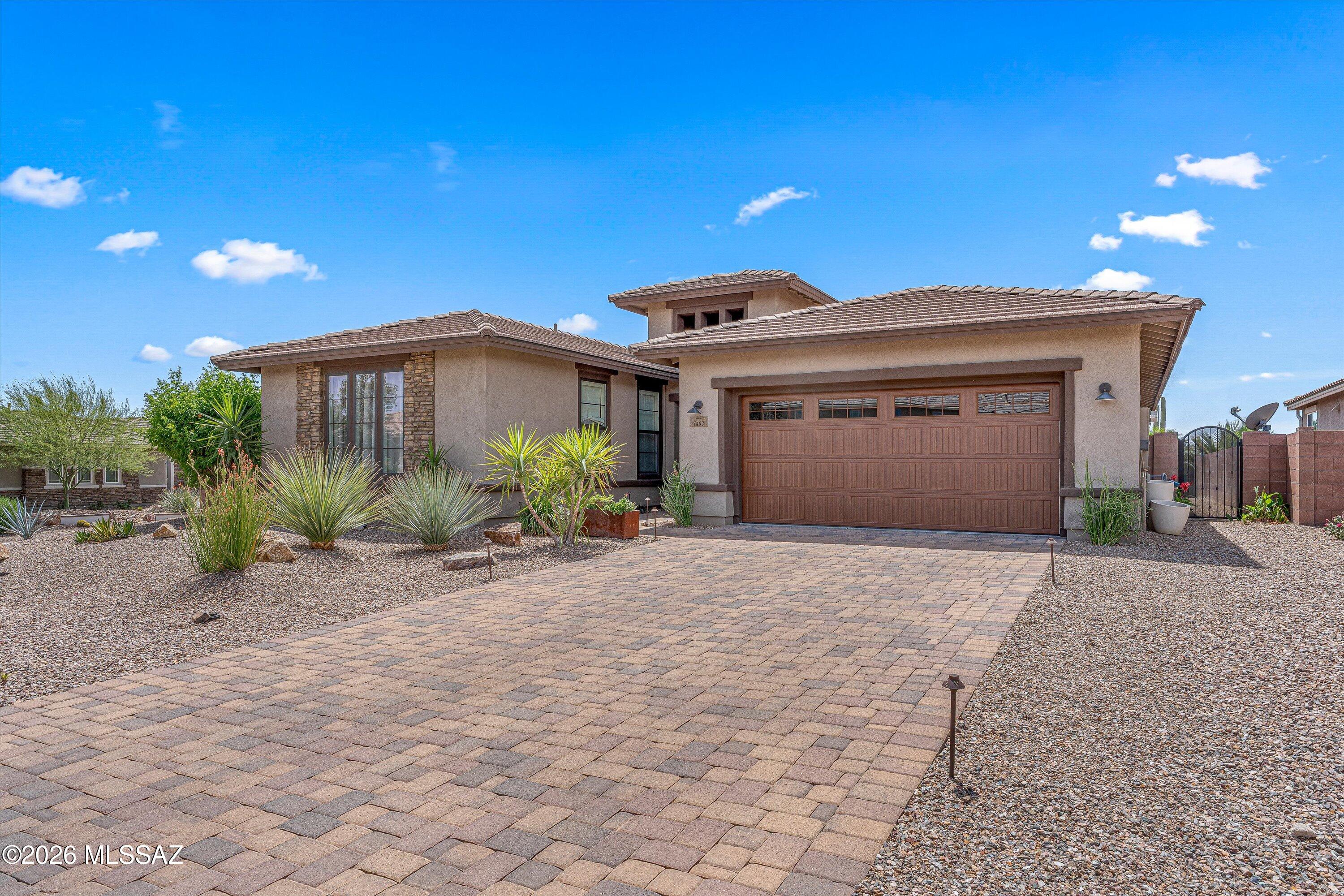Welcome to an exceptional, fully upgraded single-story home in the highly sought-after Dove Mountain area of Marana--where design, quality, and attention to detail are evident in every space.From the moment you arrive, the home makes a statement with a paver driveway, stacked stone accents, and professionally designed desert landscaping featuring agave, yucca, and mature plantings that create a warm and elevated curb appeal.Step through the striking glass and steel entry door and you're immediately drawn to breathtaking views framed straight through the home--setting the tone for what's inside.The great room is nothing short of impressive, featuring soaring wood plank ceilings with integrated lighting, a dramatic fireplace, and custom built-ins. Expansive glass