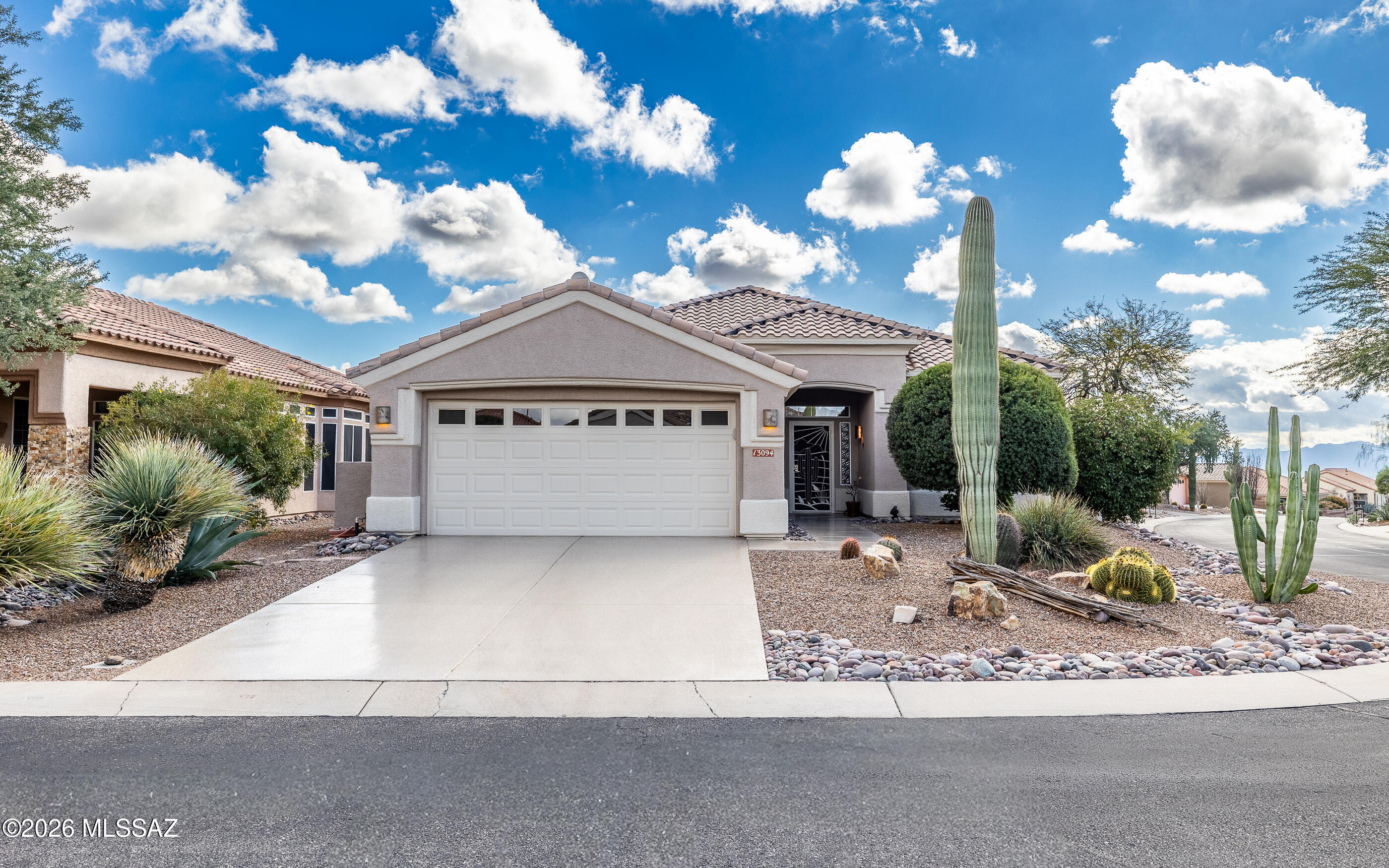 Highly popular Hillsboro model with very nice upgrades plus backyard mountain views & roof underlayment replaced roughly 3.5 years ago so you are good on the roof! Beautiful luxury vinyl plank throughout majority of home, granite kitchen counters, unique and lovely white-washed kitchen cabinets, newer gas range. Plantation shutters bring elegance. Guest and master bathrooms have upgrades/updates. Entry porch has custom epoxy concrete design, walkway and full garage shine with beautiful epoxy. Garage has full length storage cabinets. Back porch/patio has sunscreens and hosts vibrant Catalina Mountain views. HVAC system has been replaced once (not brand new but certainly not original), hot water heater replaced in 2024. Nice corner lot. Home is clean, warm and welcoming and move-in-ready.