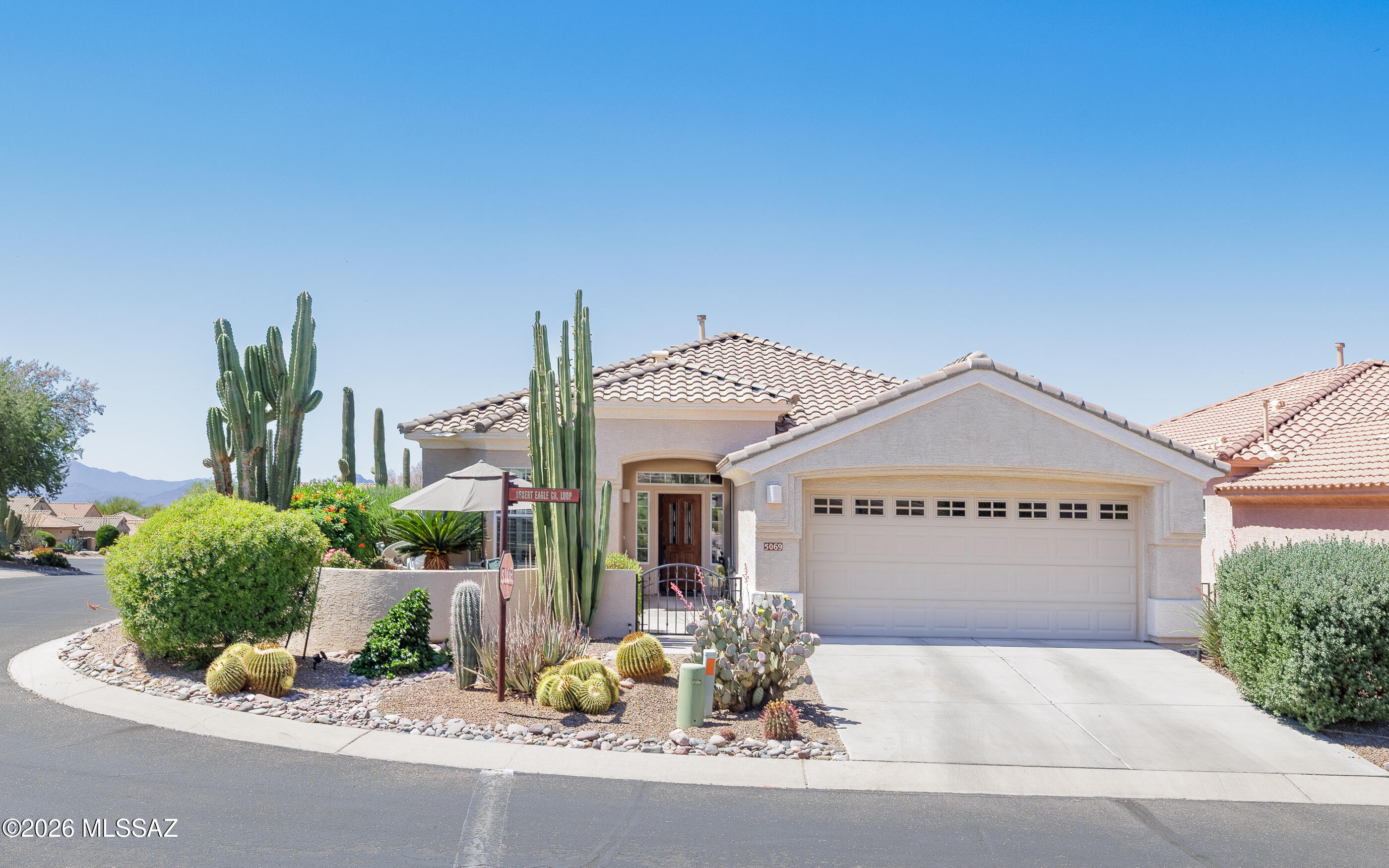 Highly popular Hillsboro model w/gorgeously landscaped grounds. Relax in the peaceful & relaxing front gated courtyard w/lovely mountain views. Backyard has extended flagstone patio & solar shades. HVAC replaced in 2017, hot water heater shortly afterwards. Home has 2 bay windows (both bedrooms), elegant plantation shutters, cozy gas fireplace in great room + fire pit on back patio. All stainless kitchen appliances & laundry (Speed Queen) appliances convey. High end new Bosch refrigerator awaits you! Exterior has been painted within past few years. All patio flagstone freshly sealed Apr 2026, along w/newly epoxied garage floor also in Apr 2026. Extra den/office area. Brand new carpet in both bedrooms. Seller fully fenced the back & side yards. Great for dogs & to keep other critters out!