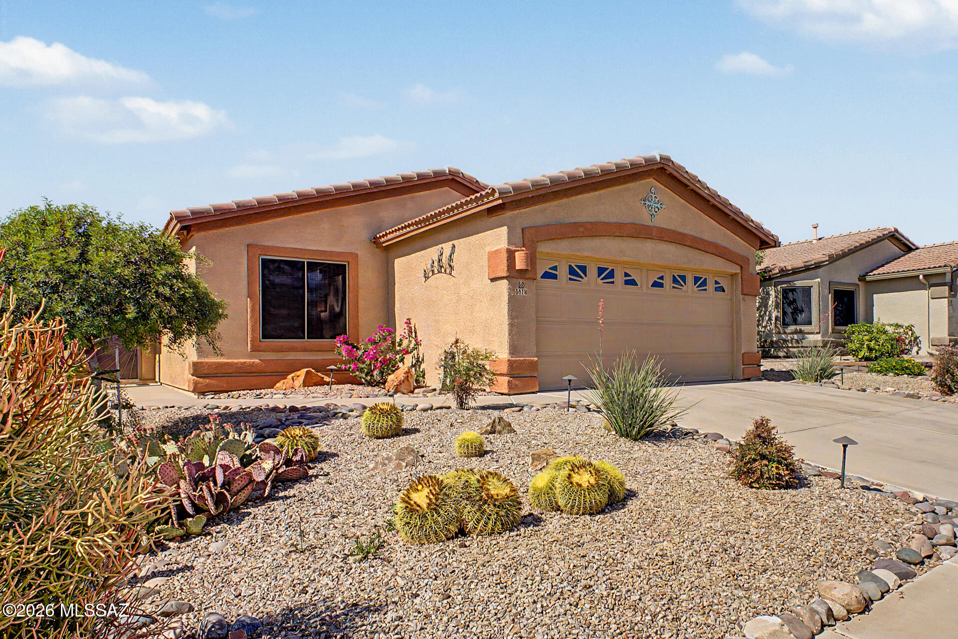 3 bedroom, 2 full bath home sits on a quiet cul-de-sac in the Villages at Dove Mountain. The sundrenched split floor plan boasts no carpet throughout, a corner gas fireplace in the living room, and a spacious kitchen with many cabinets, a pantry, dining area, granite countertops, and a brand new refrigerator. Additional upgrades include a newer HVAC, water softener, and irrigation system. Step outside to your large, private fenced backyard, perfect for entertaining or enjoying beautiful Arizona evenings, and a garage offering extra storage to keep everything organized. The location couldn't be better -- just a stone's throw from Dove Mountain Community Park, featuring basketball, tennis, sand volleyball, BBQ grills, a playground, dog parks, and scenic walking trails right at your doorstep!
