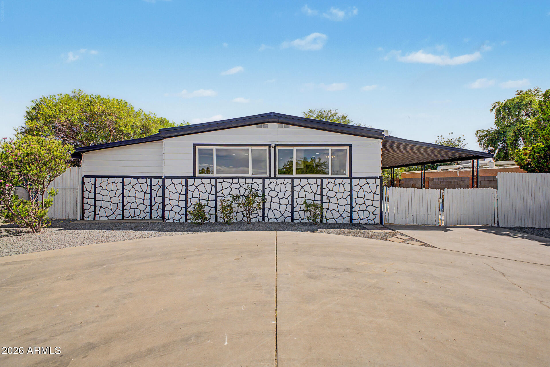 Home, sweet home! This charming 3-bedroom manufactured home welcomes you with a circular driveway, a low-maintenance desert landscape, and a gated carport. Inside, enjoy an updated open layout with recessed lighting, a soothing palette, and attractive wood-look flooring. The kitchen shines with granite counters, white shaker cabinets with crown moulding, stainless steel appliances, and a pantry. Recent major upgrades includes a brand-new AC system and all-new plumbing-adding comfort and peace of mind. You'll also find a versatile room, ideal for hobbies, work, or relaxation. The main bedroom includes a private bathroom for added comfort. Unwind at the end of a long day in the sizeable backyard, featuring an open patio, storage shed, and a mature tree for natural shade. Make it yours today!