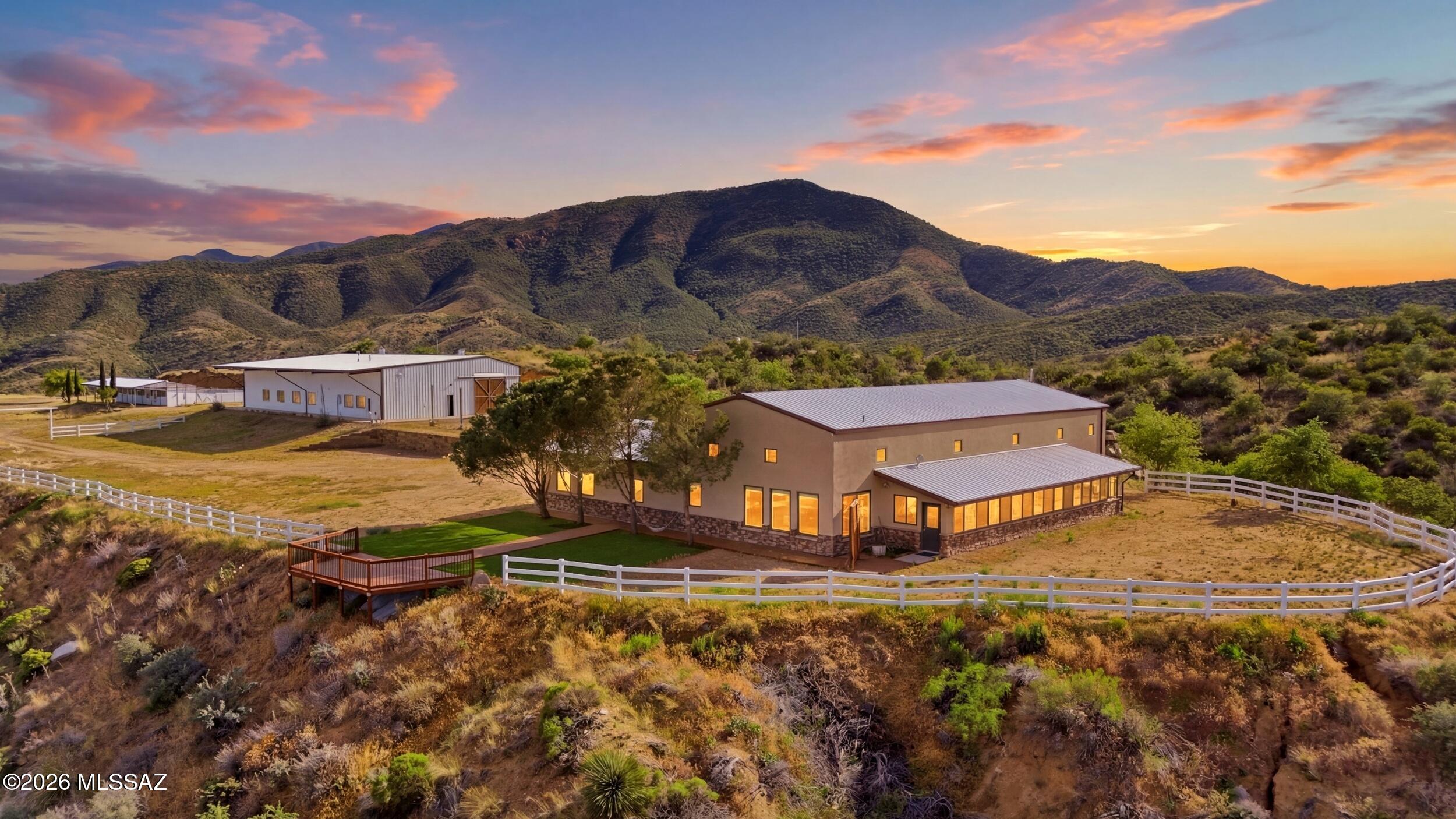 Hilltop Luxury with Panoramic Views & Endless Possibilities. Custom-built estate on 7 private acres surrounded by Coronado National Forest with mature trees & direct Arizona Trail access. Primarily single-level living with loft above. Light-filled interior with vaulted wood ceilings, spacious kitchen with breakfast bar & dining area, plus entertainer's lounge with built-in bar, drop-down movie screen, & pool table area. Arizona Room with built-in BBQ opens to patios & scenic platforms perfect for gatherings. Main home offers 3 bonus rooms, highlighted by a metal roof & natural rock. No HOA-bring your toys and RVs with full hookups. Includes a permitted 5,000 sq ft climate-controlled garage/barn with two RV doors, half bath, office, laundry, & a bonus suite with adjacent kitchen & bathroom.