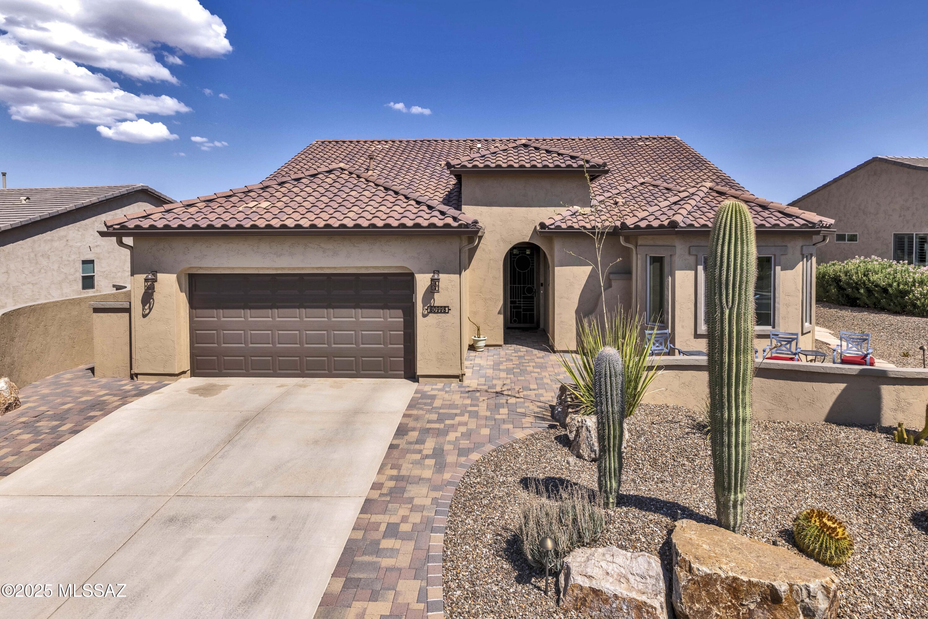 Welcome to this 1,989 sq. ft. Artesa Model on a premier lot in SaddleBrooke Ranch. Thoughtfully sited for privacy and efficiency, the home enjoys Mount Lemmon views from the shaded front patio and added space from the arroyo behind. Inside, arched accents, upgraded tile, plantation shutters, and custom cabinetry create timeless comfort. The kitchen shines with granite counters, Blanco sink, soft-close cabinets, and under/over cabinet lighting. Outdoor living features pergolas with lighting, sealed patios, mesquite trees, and gas/electric grill hookups. A 4-ft extended garage with storage and golf cart space completes this meticulously maintained property.