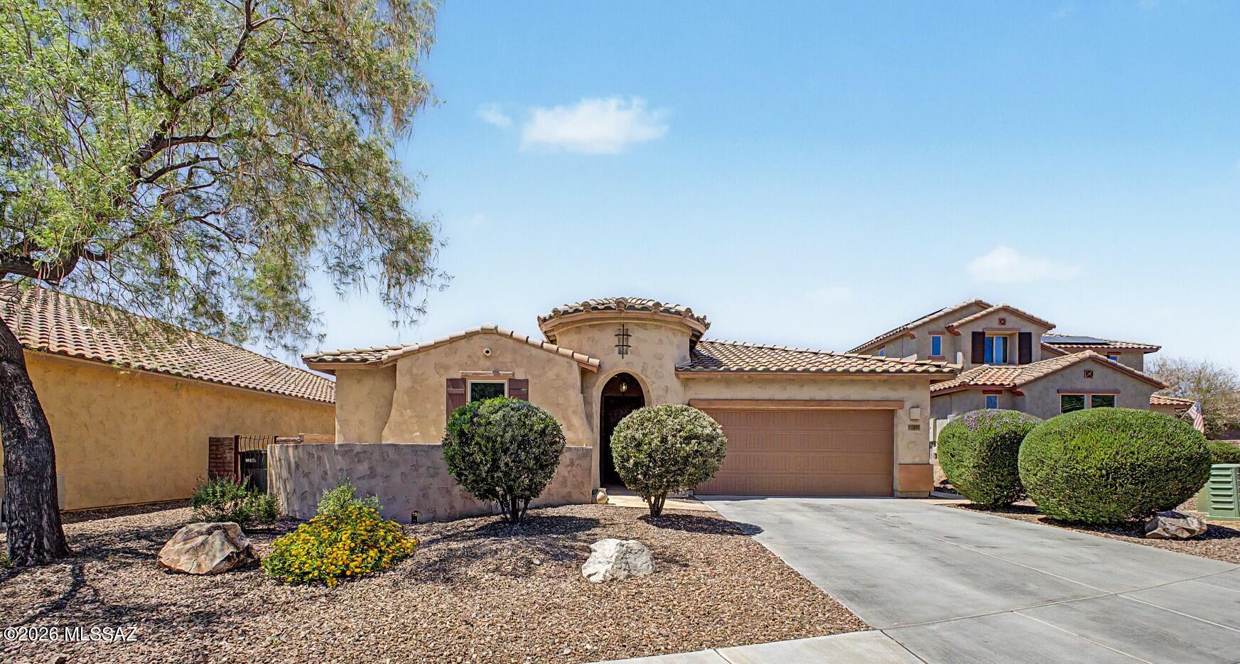 Don't miss out on this stunning home located in the gated community of Hohokam Mesa in the sought after community of Rancho Vistoso. This contemporary home features 2485 sq ft, 3 bedrooms, 2 bathrooms, a den, and a spacious 3-car garage, offering an ideal blend of both luxury, comfort, and functionality. From the moment you arrive, you are welcomed by a charming interior courtyard, low-maintenance landscaping, and a covered front porch that creates an inviting first impression.The interior showcases an elegant foyer, bright, and inviting living spaces thoughtfully designed with a neutral color palette, abundant natural light, plantation shutters, and a blend of tile flooring with carpet in select areas. A versatile den provides the ideal space for a home office, study, or fitness