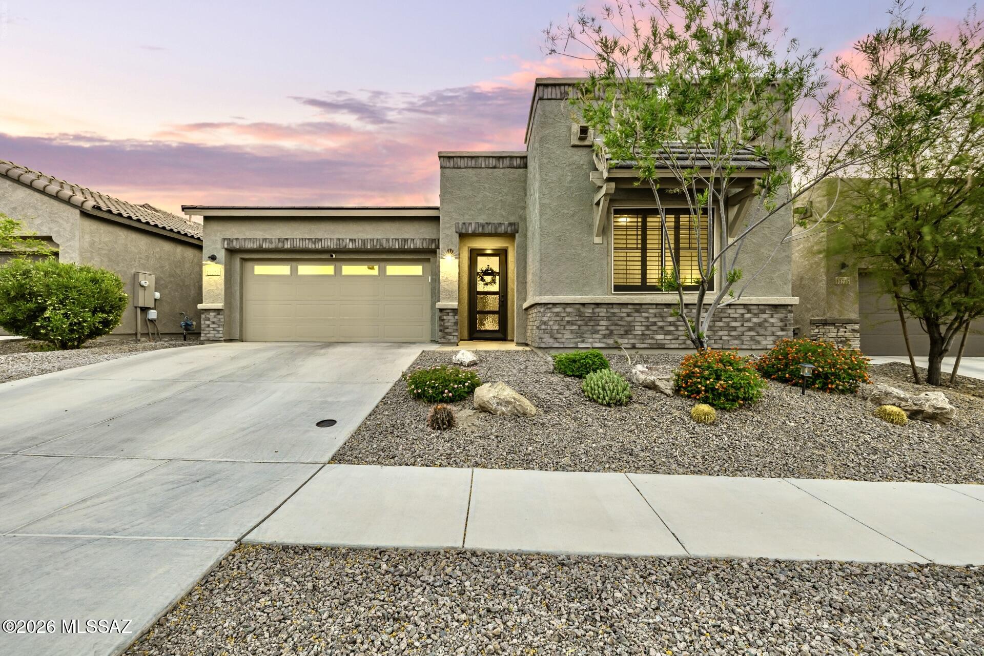 Gorgeous 2 Bed+Den Contemporary home with luxury design finishes! Split floor plan-Open Great Room, Custom fireplace with views of your patio with stunning sunsets! Kitchen is made for entertaining with huge island, upgraded granite, tile backsplash, walk in pantry, gas range & plenty of space for the gourmet cook! Tall double sliding patio doors open to the extended patio, soothing sounds from the custom rain curtain fountain, pavers, turf & the perfect Spool (Pool/Spa) Patio has custom electric screens to enclose patio & extend your living space even further! Primary Suite-dual vanities, custom tile shower, huge closet & entrance to laundry room w sink & storage! Den/office with glass doors + Guest Bed/Bath! Epoxy garage flors + overhead storage racks. Beautifully maintained & designed!