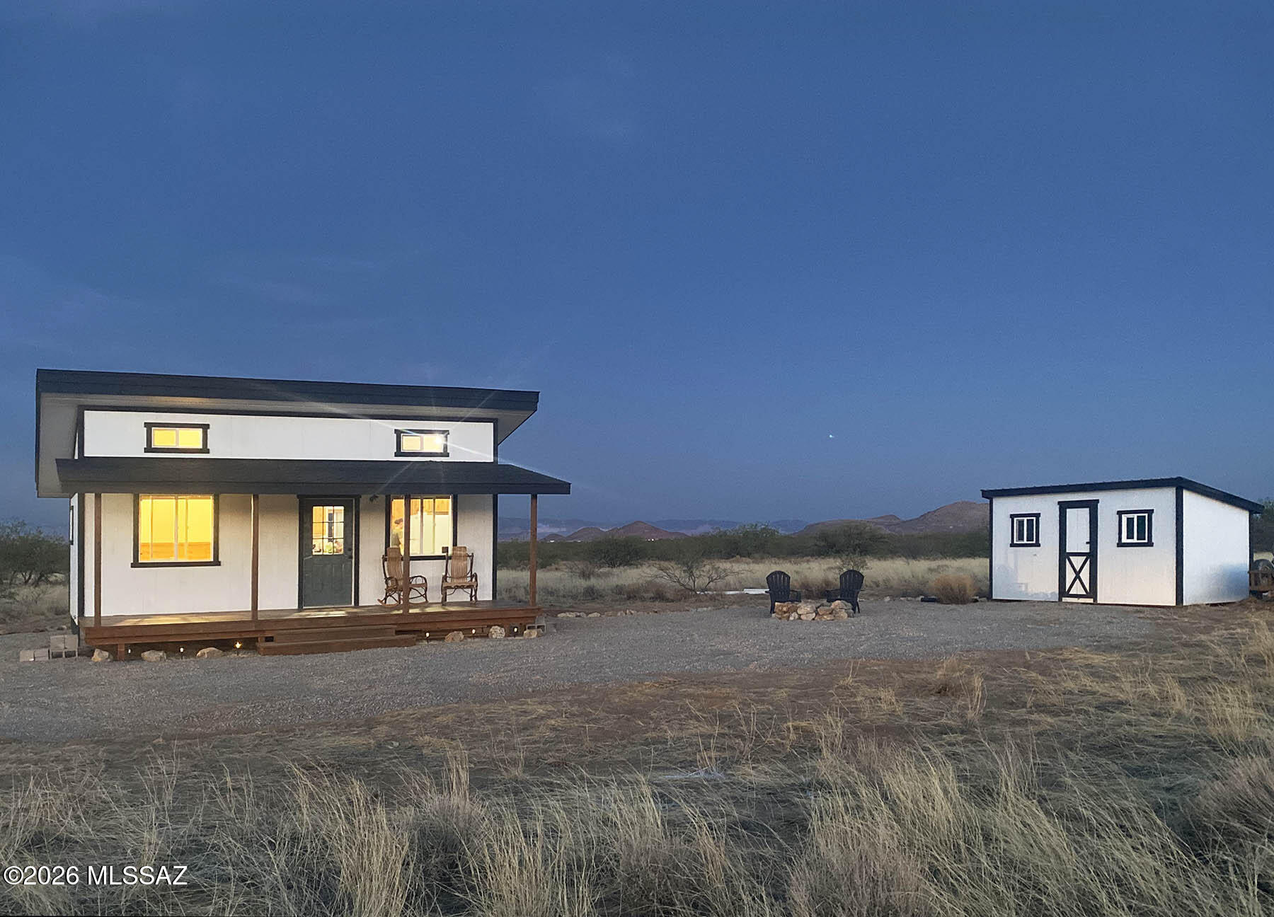 Nearly new (built 2025) off-grid tiny home on 1.7 acres with outstanding Dragoon Mountain views. The 384 sq ft cabin (24' x 16') features a large 8' x 24' covered porch perfect for enjoying desert sunsets and wildlife. Designed for comfortable off-grid living with solar power and battery storage, new septic system, storage shed, 2,200-gallon water storage tank with refill service, propane heat, on-demand hot water, propane range/oven, dual propane/electric refrigerator, and full-size washer & dryer. Interior includes custom knotty alder cabinets and a new bathroom with shower. 8' x 14' storage shed and furniture included. Corner lots on two county-maintained roads. No neighbors! A quiet high-desert setting ideal for a weekend getaways, country retreats, or full-time peaceful rural living.