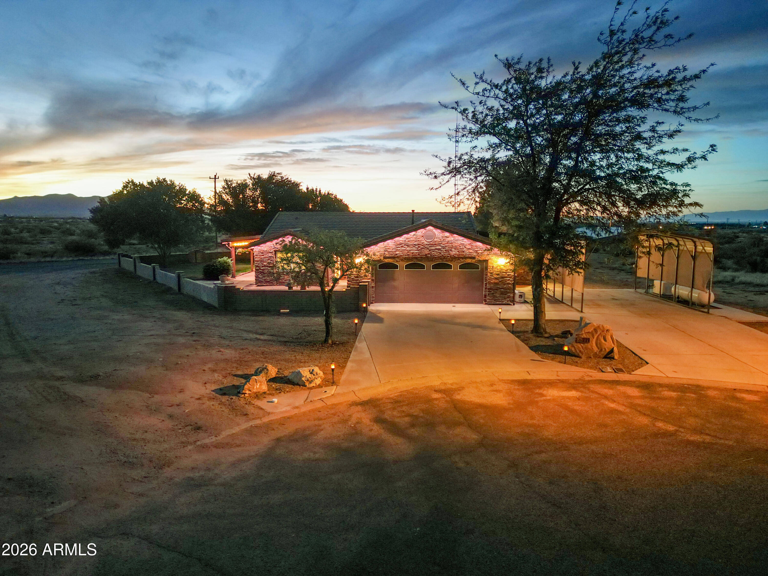 Step into a home where warmth, craftsmanship, and outdoor living come together seamlessly. Natural stone finishes flow throughout the home, complemented by exposed wood beams, plantation shutters, and thoughtful upgrades. The kitchen features granite countertops, stainless steel appliances, a walk-in pantry, and a second pantry for added storage. Designed for comfort and flexibility, the home includes two master suites and a den (approx. 14.5' x 14.5'). The outdoor living space is exceptional, showcasing a covered patio with a stone fireplace, outdoor kitchen with grill and pizza oven, and sweeping views of the Stronghold Mountains. Additional highlights include a 400 sq ft shop included in the square footage, full concrete RV pad with hookups, block-walled backyard, city water and sewer, natural gas hookup, 24kW generator with 300-gallon owned propane tank, tankless water heater, and extensive outdoor entertaining space--perfect for year-round living and entertaining.