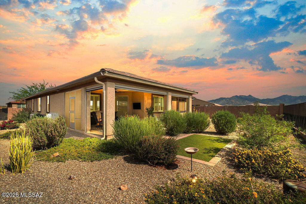 Set on a premium view lot in the gated Arbor at Madera Highlands community, this 2023 Meritage Mesquite floor plan delivers a refined blend of modern comfort, thoughtful upgrades, and a move in ready alternative to new construction. Designed for effortless everyday living and relaxed entertaining, the home has been meticulously enhanced with over $45,000 in seller added improvements ensuring every detail is already complete.Inside, wood look tile flooring flows through the main living areas, complemented by upgraded lighting, ceiling fans, and custom plantation shutters that add timeless style, privacy, and energy efficiency throughout the home. The kitchen stands at the heart of the home, featuring an expansive island, 42-inch cabinetry, Whirlpool stainless appliances, a built-in gas