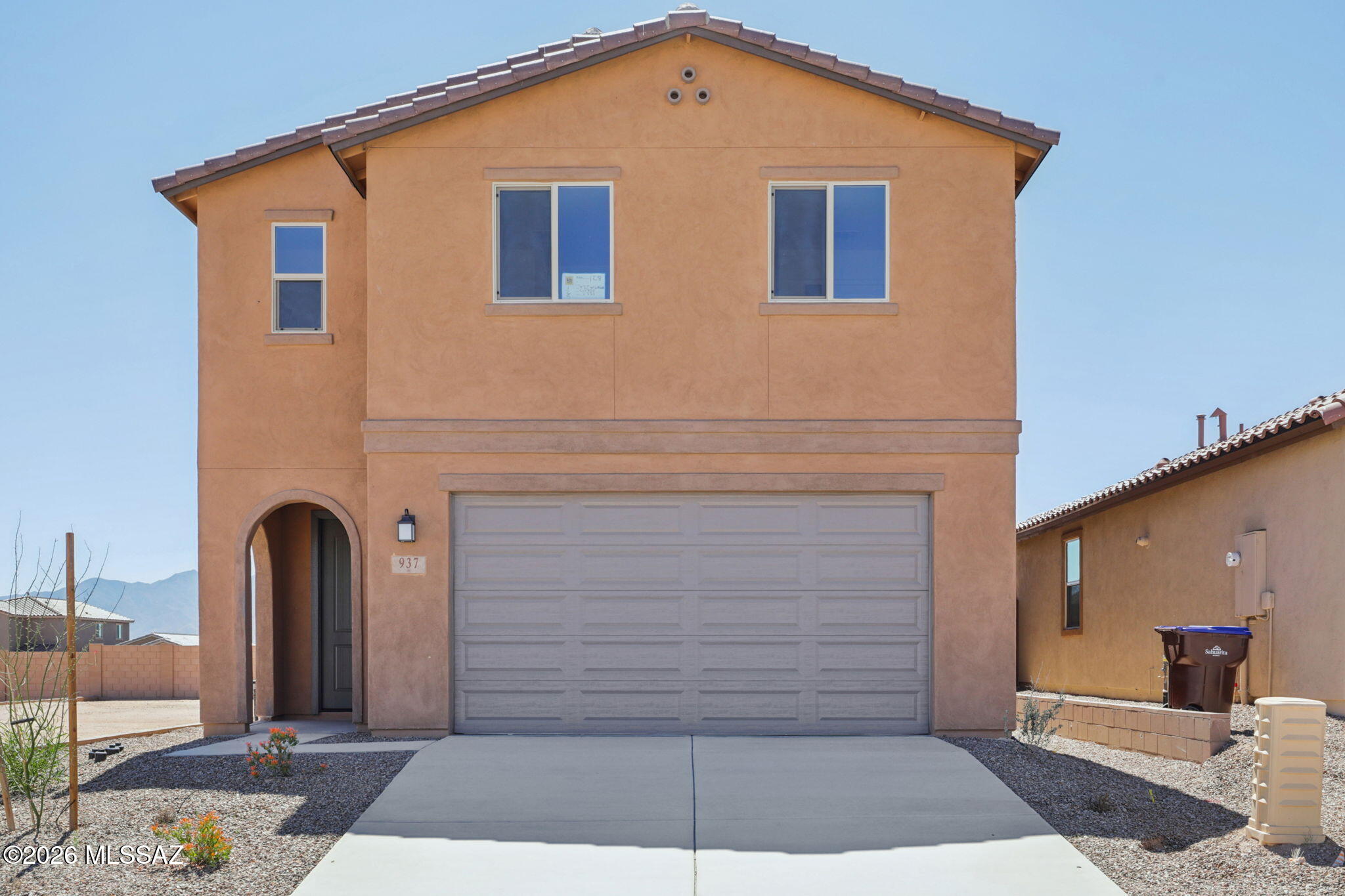 Brand new community in Rancho Sahuarita master plan. This two-story home features 4 bedrooms plus a loft, a 9-ft. ceiling height at the first floor, and porcelain tile flooring throughout. Overlooking the expansive great room, the kitchen showcases granite countertops, 42'' white upper cabinets, an island, large walk-in pantry, and Whirlpool(r) stainless steel appliances. Upstairs, the loft provides space for workouts and movie night. The primary bedroom boasts a generous walk-in closet and connecting bath with a dual-sink vanity and walk-in shower. Bedroom 3 includes a walk-in closet. Enjoy the outdoor air on the covered back patio. Price includes discount predicated on using seller's preferred lender KBHS.