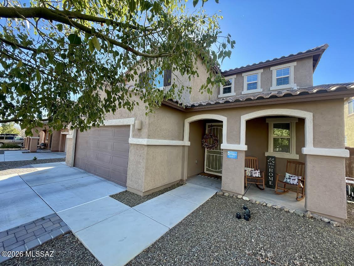 Rare Find: this two-story residence with in-law suite offers a comfortable open layout designed for everyday living and entertaining. The main living area flows seamlessly into a spacious dining area and kitchen featuring extensive cabinetry, granite countertops, stainless steel appliances, a gas range, and a center island with additional prep space. Large windows and a sliding glass door bring natural light into the living room and provide easy access to the backyard. Wood-style flooring adds warmth throughout the main level. Bonus living suite has own front entrance, bedroom, living area and bathroom. The home's exterior includes a welcoming covered front porch and a two-car garage with a wide driveway.