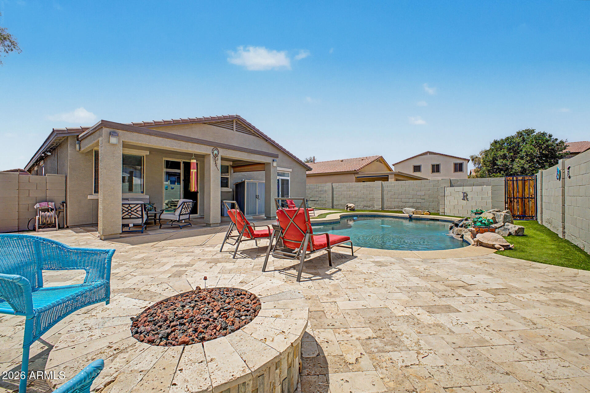 Single-story home in Johnson Ranch offering 3 bedrooms, 2 bathrooms, plus a DEN and an additional FLEX SPACE, giving you the flexibility to truly make this home your own. Whether you need a second living area, hobby room, playroom, or a work-from-home setup, this layout delivers. Currently configured as two separate offices, it's ideal for today's lifestyle. Step outside and enjoy Arizona living at its best with a heated pool featuring a beautiful waterfall, perfect for relaxing or entertaining year-round. Inside, you'll find updated vinyl plank flooring in the bedrooms (no carpet!) and a well-appointed kitchen with granite countertops, upgraded cabinetry, gas stove, and a walk-in pantry. The spacious primary suite offers dual vanities, a separate tub and shower...SEE MORE... and private access to the backyard and pool, creating your own peaceful retreat. A convenient Jack & Jill bathroom connects the secondary bedrooms. The backyard is thoughtfully designed for low maintenance and maximum enjoyment, complete with extensive pavers, a built-in gas firepit, and a covered patio. There's even a gas line ready for your BBQ grill. Additional features include a freshly painted exterior for great curb appeal, an RV gate with access to a separate fenced side yard, a tankless water heater, and a newer pool pump (installed September 2018). This home blends comfort, functionality, and outdoor living in all the right ways.