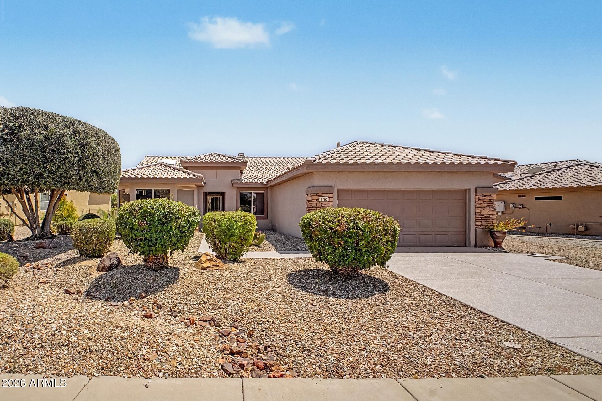 Beautifully maintained single-story home in Sun City Grand! Popular Coronado floorplan featuring 2 bedrooms, 2 bathrooms plus a versatile den/office. Bright eat-in kitchen with bay window, stainless steel appliances, and plenty of cabinet space. Spacious primary suite includes a sitting area, walk-in closet, and views of the backyard. Enjoy Arizona living with a private pool, covered patio, and large 9,000+ sq ft lot with mature landscaping and fruit trees. Recent updates include a new HVAC system (2022). Located in a sought-after active adult community with golf, pickleball, tennis, and more. Move-in ready! All furniture pictured conveys with the property. Buyer to verify all facts and figures.