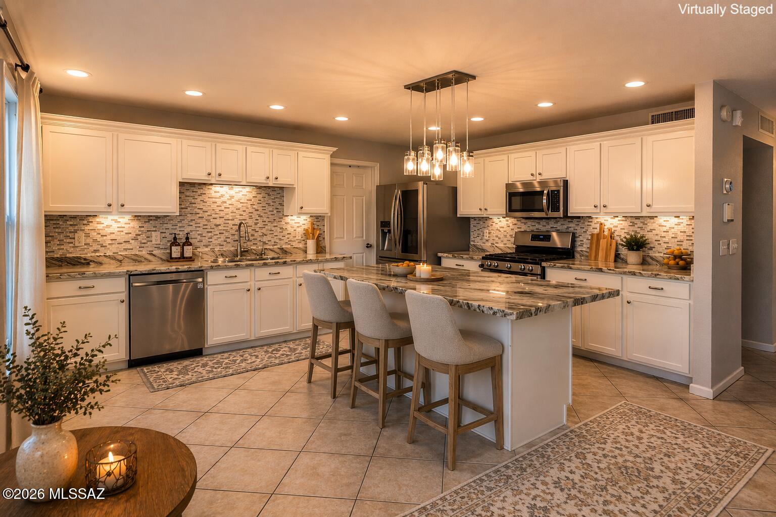 Move-in ready and beautifully maintained, this two-story home combines comfort, style, and efficiency. Inside, you'll find tile flooring, ceiling fans, fresh neutral paint, and abundant natural light that create a bright, welcoming atmosphere throughout. The spacious living room and open-concept great room provide the perfect setting for both everyday living and entertaining. The gourmet kitchen is a standout feature, complete with recessed and pendant lighting, a mosaic tile backsplash, stainless steel appliances, granite countertops, abundant white cabinetry, a walk-in pantry, and a center island with a breakfast bar.