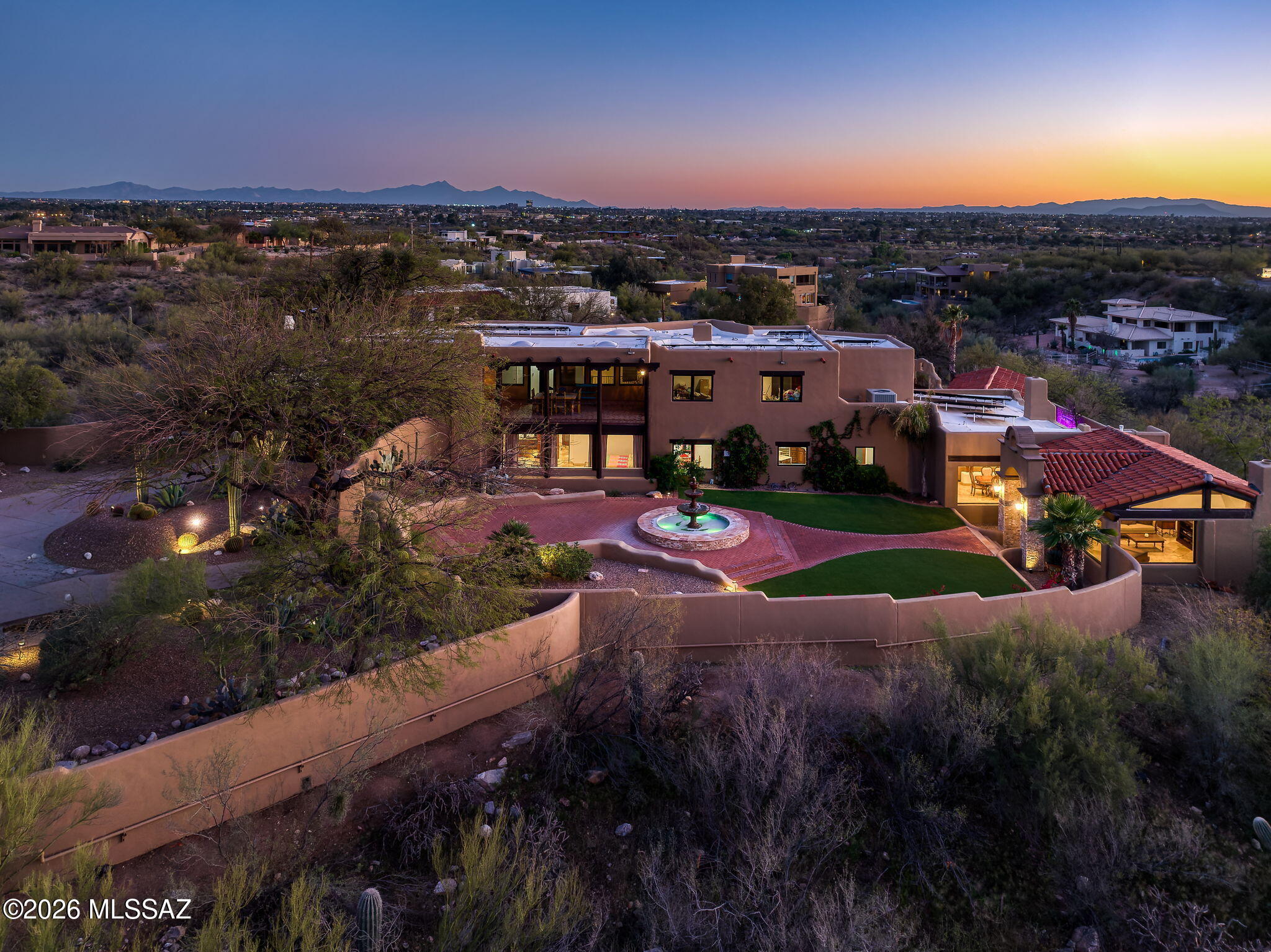 Own the ultimate private sanctuary in Tucson. This stunning 6,048 sq ft estate on 3 acres with NO HOA offers unmatched privacy and sweeping mountain and city-light views. The resort-style backyard features a dramatic stepped-tile fire waterfall pool, where flames dance above cascading water. Inside, soaring wood ceilings and six fireplaces create warmth and grandeur. The chef's kitchen boasts a Viking 6-burner range, Sub-Zero refrigeration, and dual ovens. The spacious main-level owner's suite opens to a wrap-around deck with breathtaking sunsets. Enjoy a true outdoor retreat with a full kitchen, massive ramada, lush lawn, and 4-car garage/workshop plus flex studio--perfect for a gym or creative space. A rare blend of luxury, privacy, and freedom.