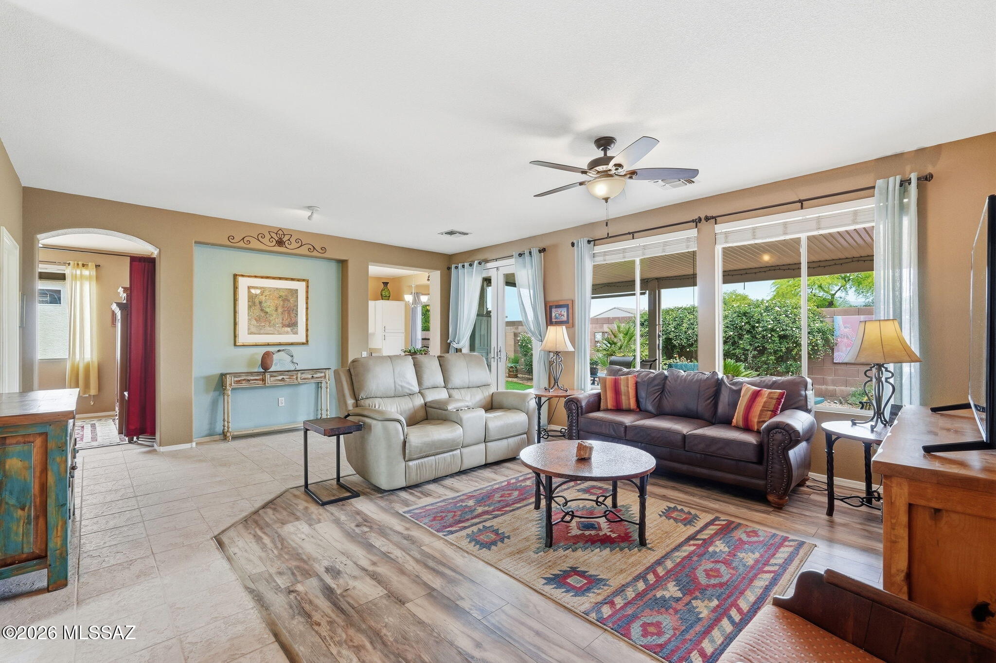 Wrap yourself in the warm glow of desert hues and lush, thoughtfully designed landscaping in this beautifully appointed two-bedroom, two-bath home, complete with a versatile den and dedicated office. The inviting kitchen is both stylish and functional, featuring stainless steel appliances, quartz countertops, and convenient pull-out cabinet organizers. Throughout the main living areas, low-maintenance ceramic tile and vinyl plank flooring offer durability with a refined finish. The bright, well-lit office provides the perfect space for hobbies or remote work, while the spacious den offers flexibility as a potential third bedroom with the addition of a Murphy bed or sleeper sofa.