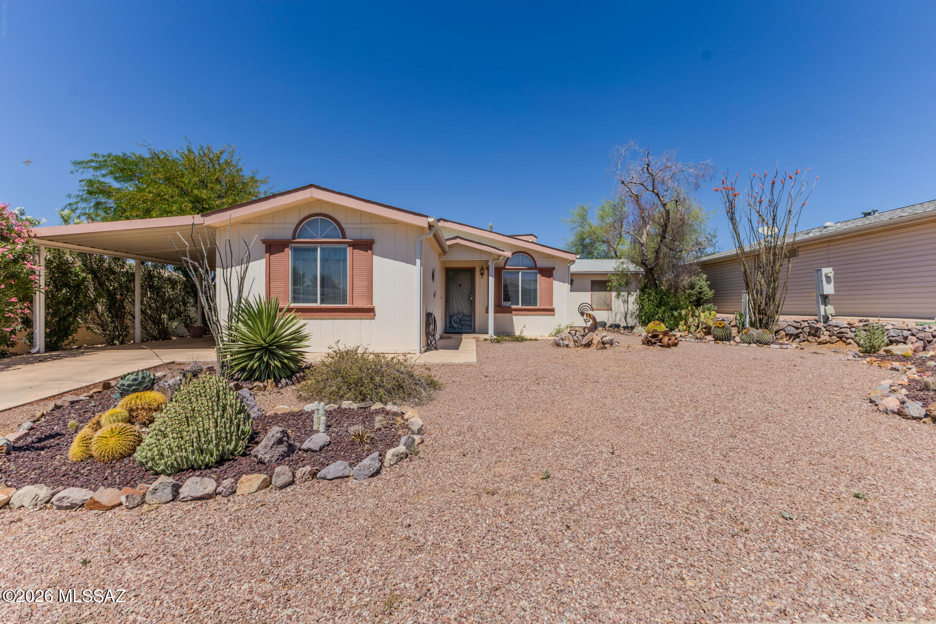 Priced to sell. Enjoy owning this lovely 2-bedroom home featuring carport parking and low-care desert landscape! Check out the inside to find an inviting living room that flows seamlessly into the dining area. Vaulted ceilings add to the airy feel, complemented by a blend of tile & carpet flooring, a neutral palette, and lots of natural light. In the kitchen, you will have matching appliances, a mosaic tile backsplash, plenty of cabinet space, and solid surface counters. The primary bedroom offers a sitting room, a walk-in closet, and a private bathroom for added comfort. Fantastic Arizona room adds extra space, perfect for entertaining guests, arts and crafts or relaxing year-round.