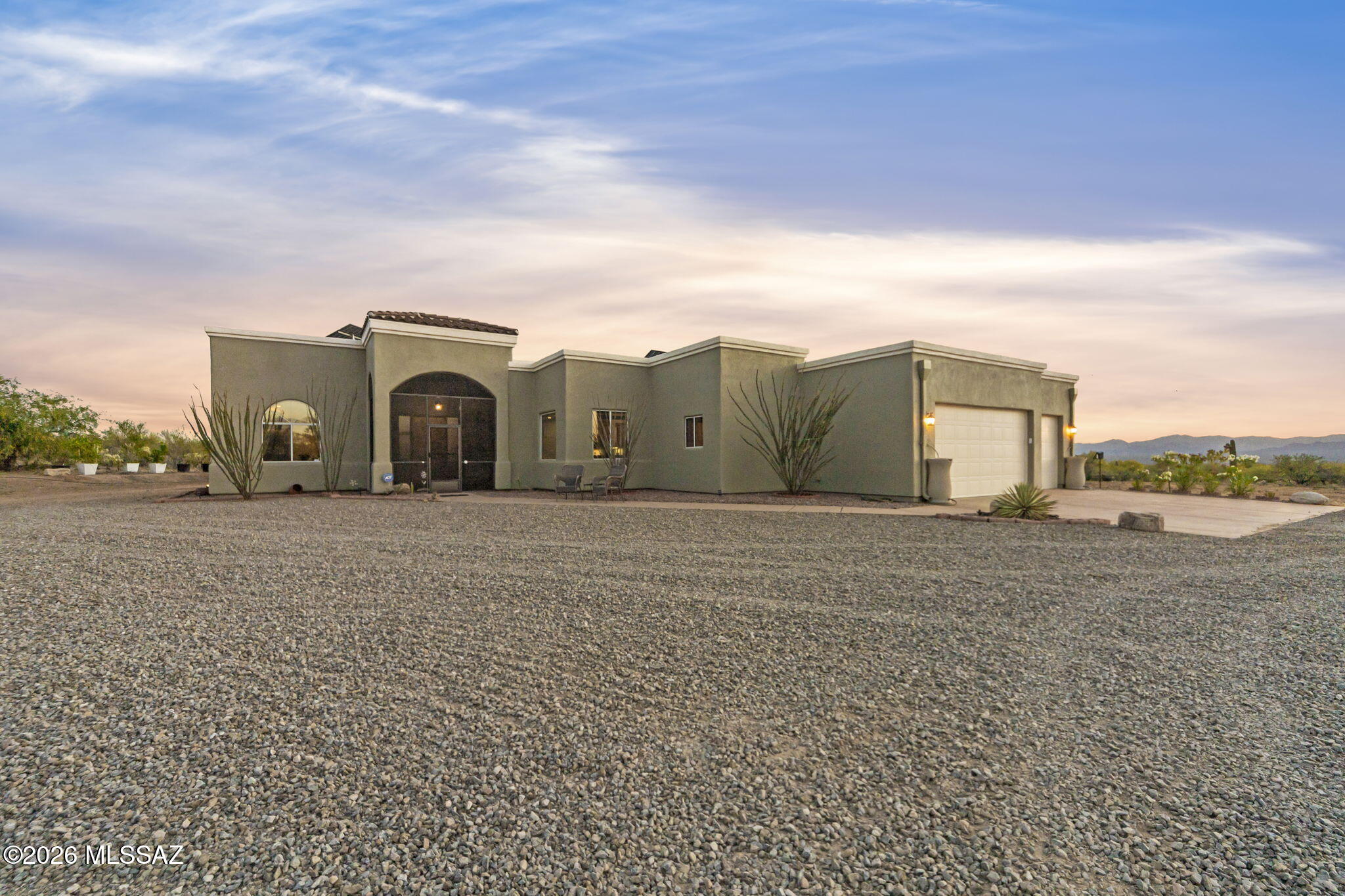 Welcome to your desert retreat in the desirable Diamond Bell Ranch Community! This contemporary 3-bedroom, 2.5-bath home is perfectly situated on 3.64 acres of an open desert setting with breathtaking panoramic mountain views. Enjoy stunning sunrises from the Arizona room and unforgettable sunsets right from your own backyard patio. This home offers the perfect balance of peaceful privacy and city convenience. Inside, the spacious kitchen features granite countertops, updated smart appliances, a commercial gas oven/cooktop, a breakfast bar, breakfast nook, and beautiful custom Alderwood cabinetry. The split-bedroom floor plan provides added privacy, while the private primary suite offers a walk-in closet, separate jetted tub, walk-in dual head shower, and dual his-and-her vanities.