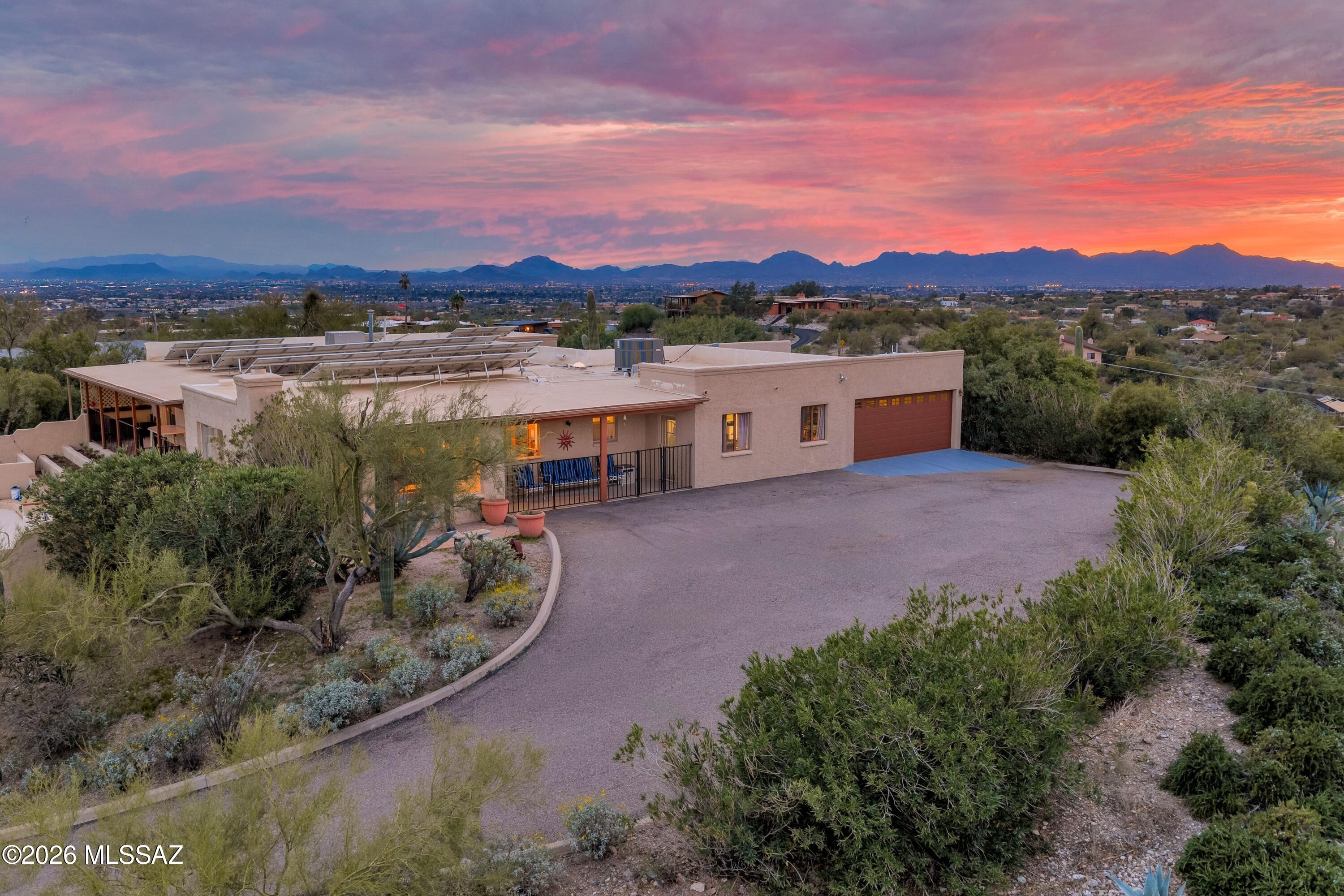 This beautiful Catalina Foothills 5 bedroom, 3 bath incredibly versatile floorplan is situated on an elevated .9 acre lot with the most magnificent views of the Catalinas, Rincons, Santa Ritas AND the Tucson Mountains NOT to mention the City Lights. So much has been done here to include a newer roof, HVAC systems, plus recently resurfaced pool/spa! The kitchen is remodeled with smart flow & great work spaces plus a view of the mountains to inspire! The current LARGE office could be a MIL suite or Rec Room with ease. The family room has a fireplace & yet more views. The living & dining rooms open to the east facing patio with glorious sunrises. The heated pool & spa have been recently resurfaced. Dual cooling. Oversized garage for added storage. Owned solar means utilities are minimal.