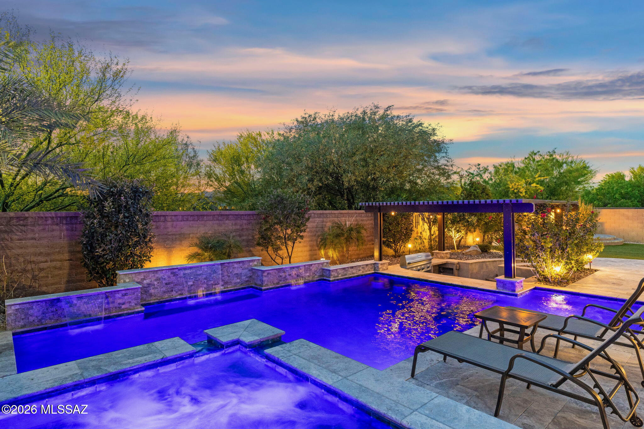 Experience true resort-style living with a custom Pentair Presidential pool and spa, seamless indoor-outdoor design, and a fully owned ~10 kW SolarEdge system delivering exceptionally low energy costs. Located in sought-after gated Center Pointe Vistoso, this home offers the perfect blend of luxury and everyday comfort. Soaring ceilings and abundant natural light highlight an open, airy layout with refined finishes, smart home features, surround sound, and three-zone climate control. Expansive sliding doors open to a private backyard retreat featuring swim-up bar stools, a sunken outdoor kitchen, firepit, and multiple lounge areas surrounded by lush landscaping for exceptional privacy and stunning mountain views. Community amenities include a heated pool, spa, grilling areas, firepits, and