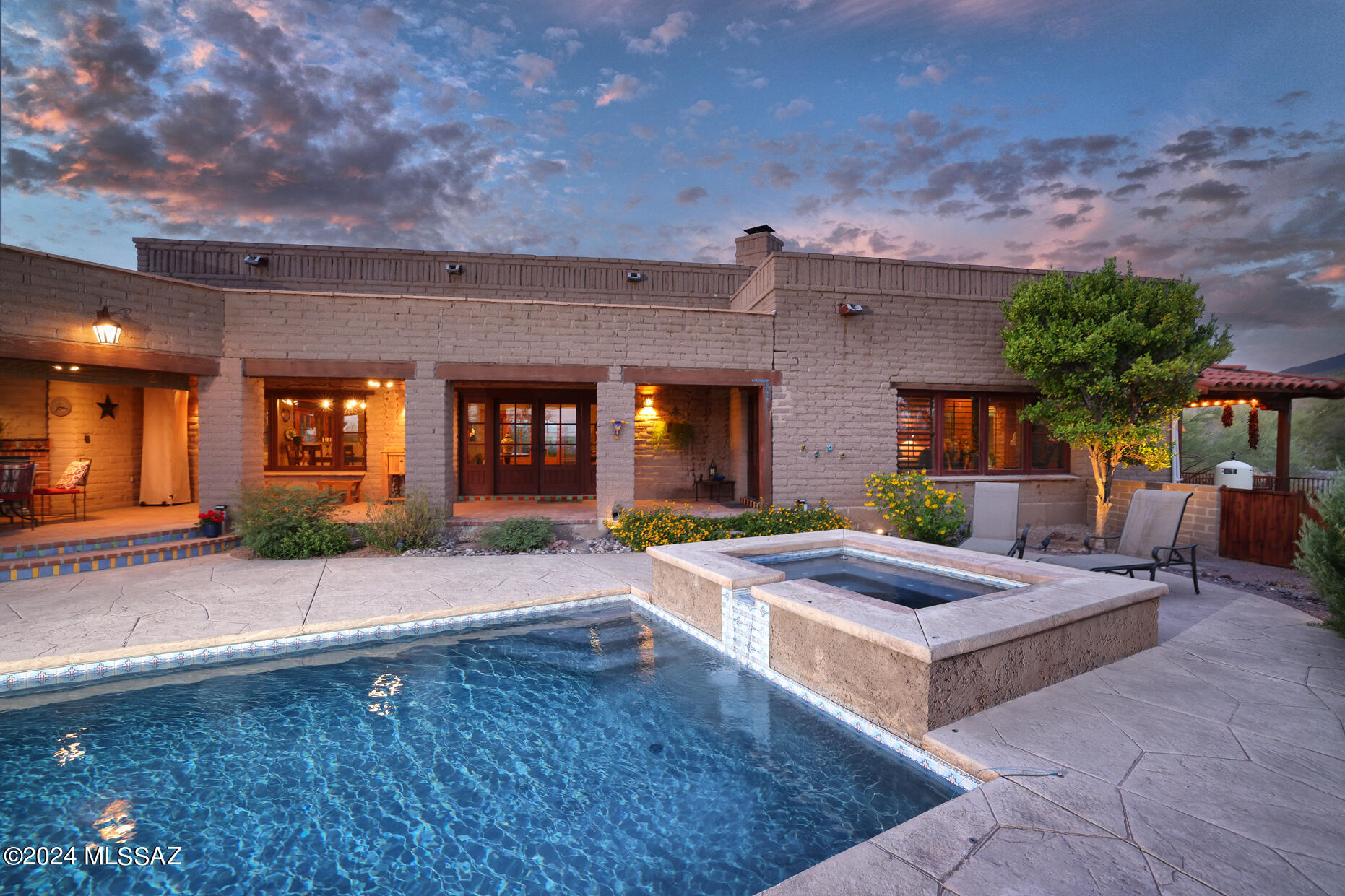 Welcome to Hacienda Puerta de Madera, a sprawling single story mud adobe Hacienda. This one-of-a-kind home is constructed from traditional sun-dried mud adobe bricks which not only is charming but provides thermal insulation. Sitting high on 3.31 acres with 5 bedrooms, 4 full baths, and 2 half baths, including a versatile gym room and a storage room converted into an office/craft space. One bedroom and bath is a separate guest suite with its own entrance. High ceilings, large windows and natural light highlight the unique adobe bricks. The gorgeous kitchen is the interior main attraction while outdoor living awaits with fully equipped BBQ area, pool, spa and outdoor dining. 4.5 car garage, fully owned solar, RV hook-up, roof top deck are just a few of the incredible features of this home.