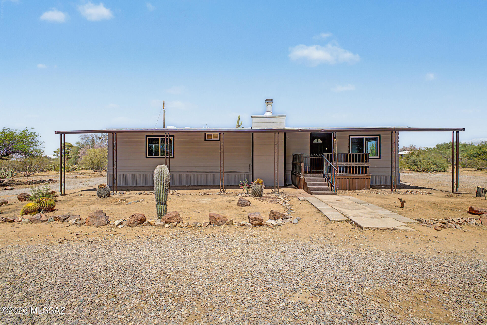 Become the proud owner of this sprawling 1.12 acre HORSE property! Discover an updated 3-bedroom, 2-bath manufactured home surrounded by a natural desert landscape. You're greeted by an inviting front porch, perfect for morning coffee or refreshing drinks. Inside, you'll find an upgraded interior featuring a serene living room w/ vaulted ceilings, a soothing palette, plush carpeting, & a fireplace for cozy evenings. The well-appointed kitchen comes w/ white shaker cabinets, a pantry, & sleek stainless steel appliances. The tranquil primary bedroom includes a private bathroom for added comfort. Unwind on the covered deck, overlooking the vast outdoor space, providing a fantastic opportunity to craft an outdoor oasis or establish equestrian facilities. Don't miss out on this one! Agent/Owner