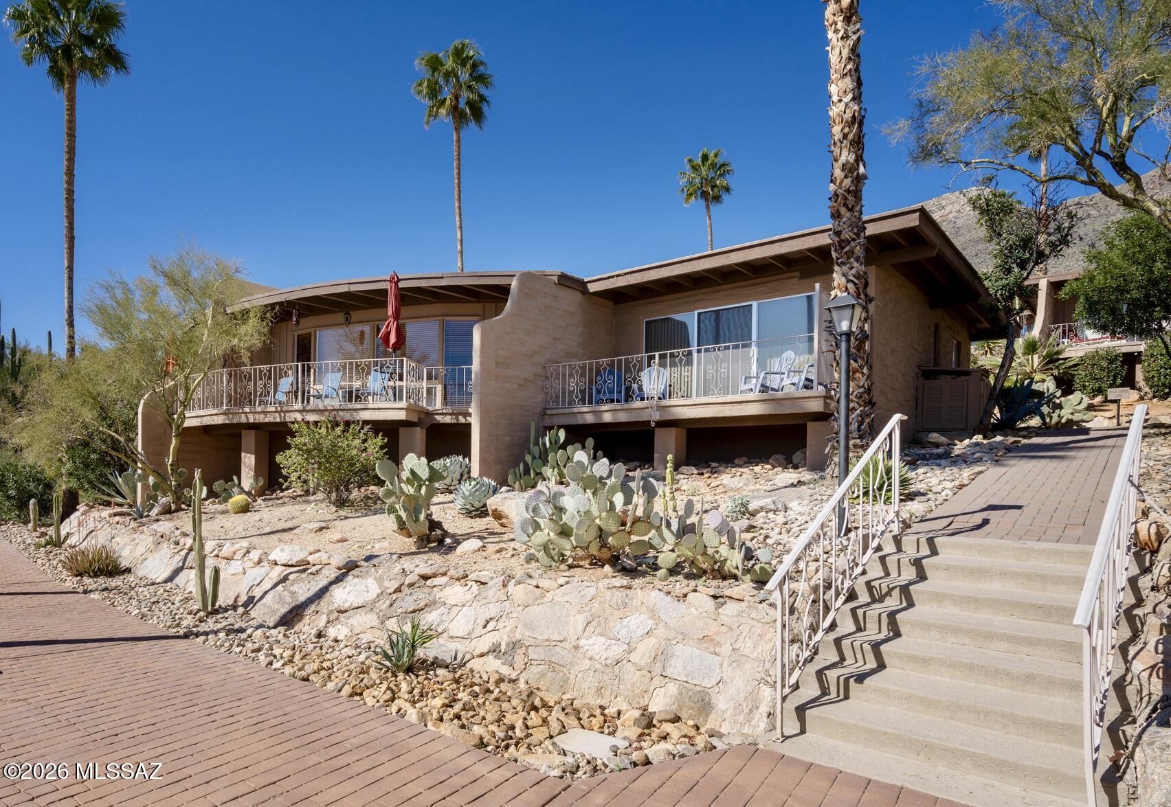 Perched high on Mission Hill within the coveted Skyline Country Club, this thoughtfully updated town-home captures sweeping views of Tucson. The layout is designed for maximum flexibility - the unit divides seamlessly into two independent spaces, each with its own private balcony, separate entrance, and full bath. Live on one side and rent the other, set up a dedicated home office, or welcome extended-stay guests without giving up your privacy. Each side has floor-to-ceiling sliding doors and windows framing the views beyond the private deck. A direct walking path connects you to all that Skyline Country Club has to offer -- without ever getting in a car.