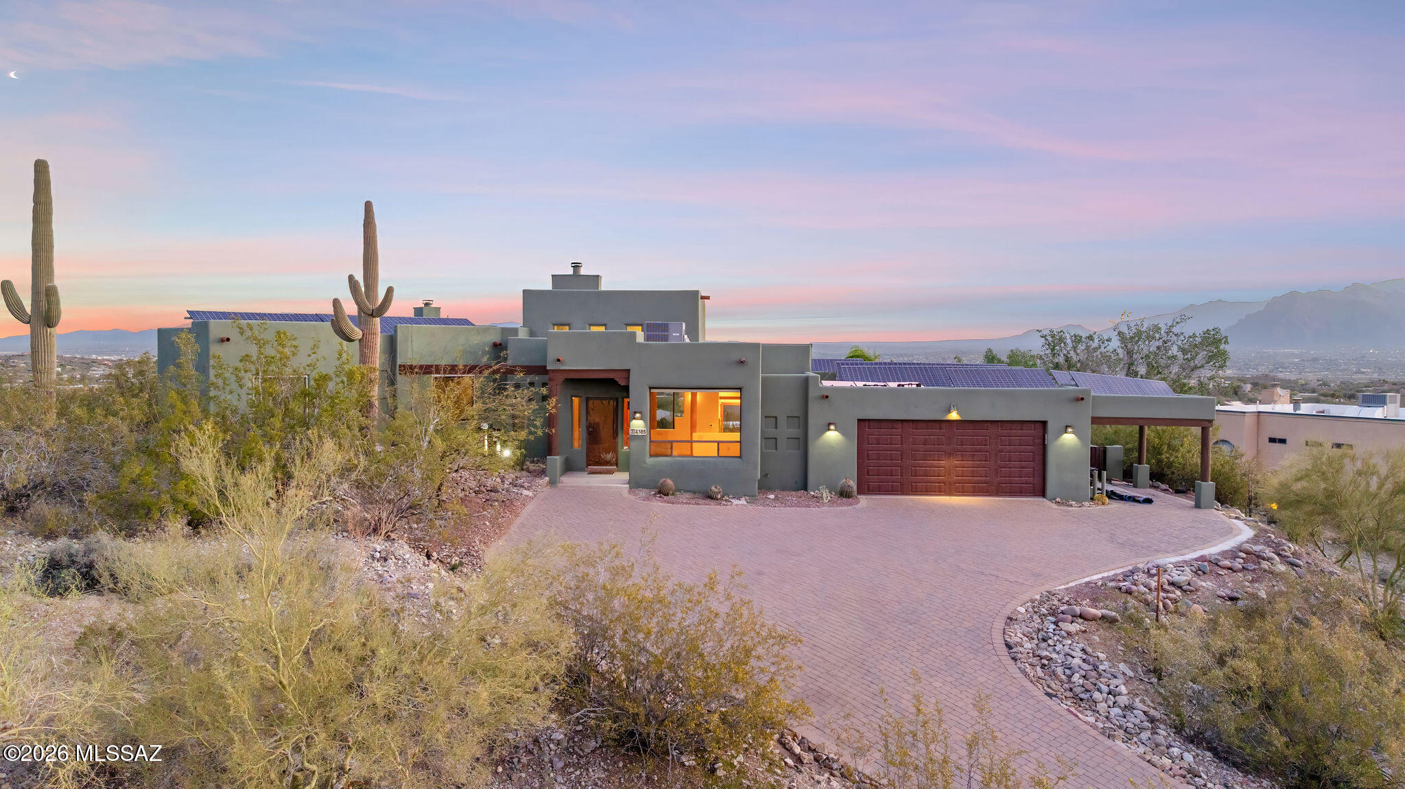 Open the door of this custom ridge top Santa Fe and you'll be amazed at the breathtaking views that lie before you! Character abounds from the gorgeous Saltillo tile floors, to the dramatic viga and pecky cedar ceilings. You'll love the primary suite from the custom updated bathroom to wood viga ceilings, cozy beehive fireplace and spectacular views of the sparkling pool, twinkling city lights and majestic Catalina mountains. Entertain your friends on the lovely patio with breath-taking eagle's nest views, an inviting beehive fireplace, built in BBQ and refreshing pebble tec pool! A rare and treasured desert sanctuary! Take advantage of the pre-paid solar lease, that has been paid in full for the remainder of the leased contract which expires in 2035