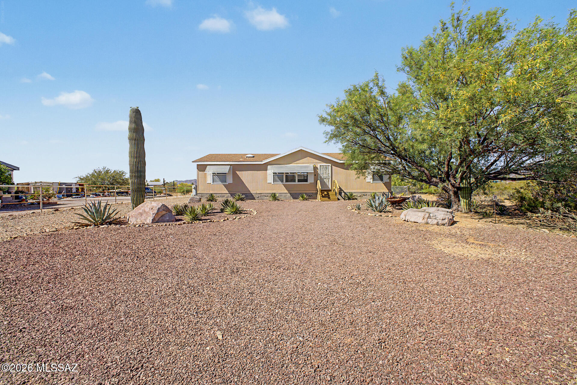 **Public Remarks:**2005 Clayton manufactured home (Model El Mirage) on nearly an acre in San Joaquin Ranch Estates. This 3BR/2BA split floor plan offers 1,456 sq ft with an open great room, gas range, double-pane windows, ceiling fans, and a dedicated laundry room. Primary suite includes double vanity and walk-in closet.Outside enjoy a detached 40x40 garage, full RV hookup, deck, and low-maintenance desert landscaping with mountain, sunrise, and sunset views. Public water, natural gas, connected sewer, and paved road access. Easy access to Tucson via the I-19/Ajo Way corridor.