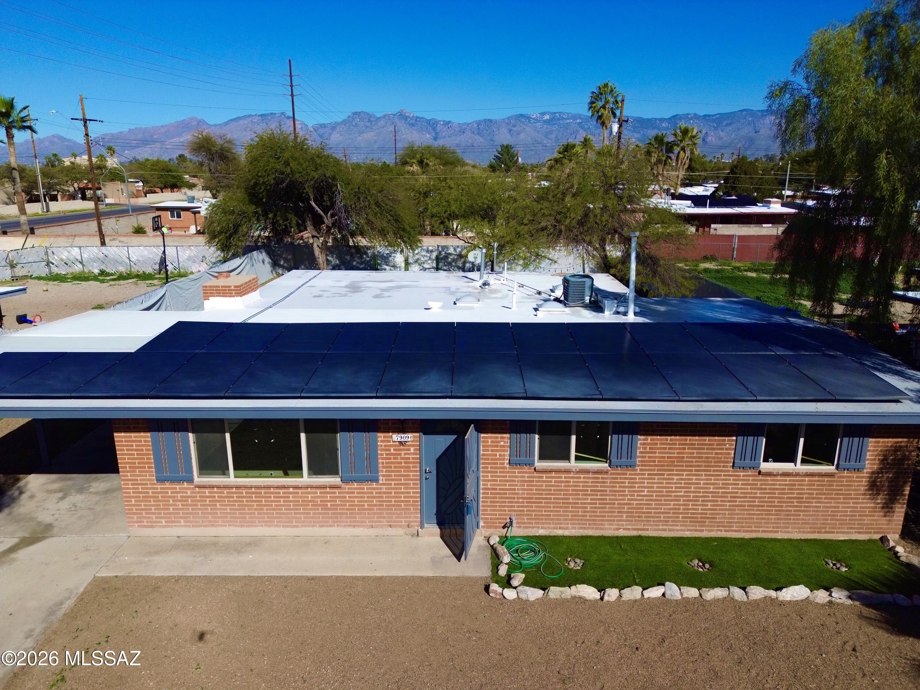 Charming brick exterior with fresh modern accents, decorative security door, and updated window shutters. Extended driveway with covered carport provides convenient parking, while mature trees and low-maintenance desert landscaping enhance curb appeal. Fully remodeled home featuring updated flooring throughout, a modern floor-to-ceiling tiled fireplace as a stylish focal point, and an open, light-filled layout. The remodeled kitchen offers a large quartz island, two-tone cabinetry, stainless steel appliances and skylights. Bathrooms are upgraded with beautifully tiled walk-in showers, including a spacious primary bath, plus an enormous walk-in closet. Enjoy a spacious backyard with covered patio and mature shade trees. Home also includes paid-off solar panels for long-term energy savings.