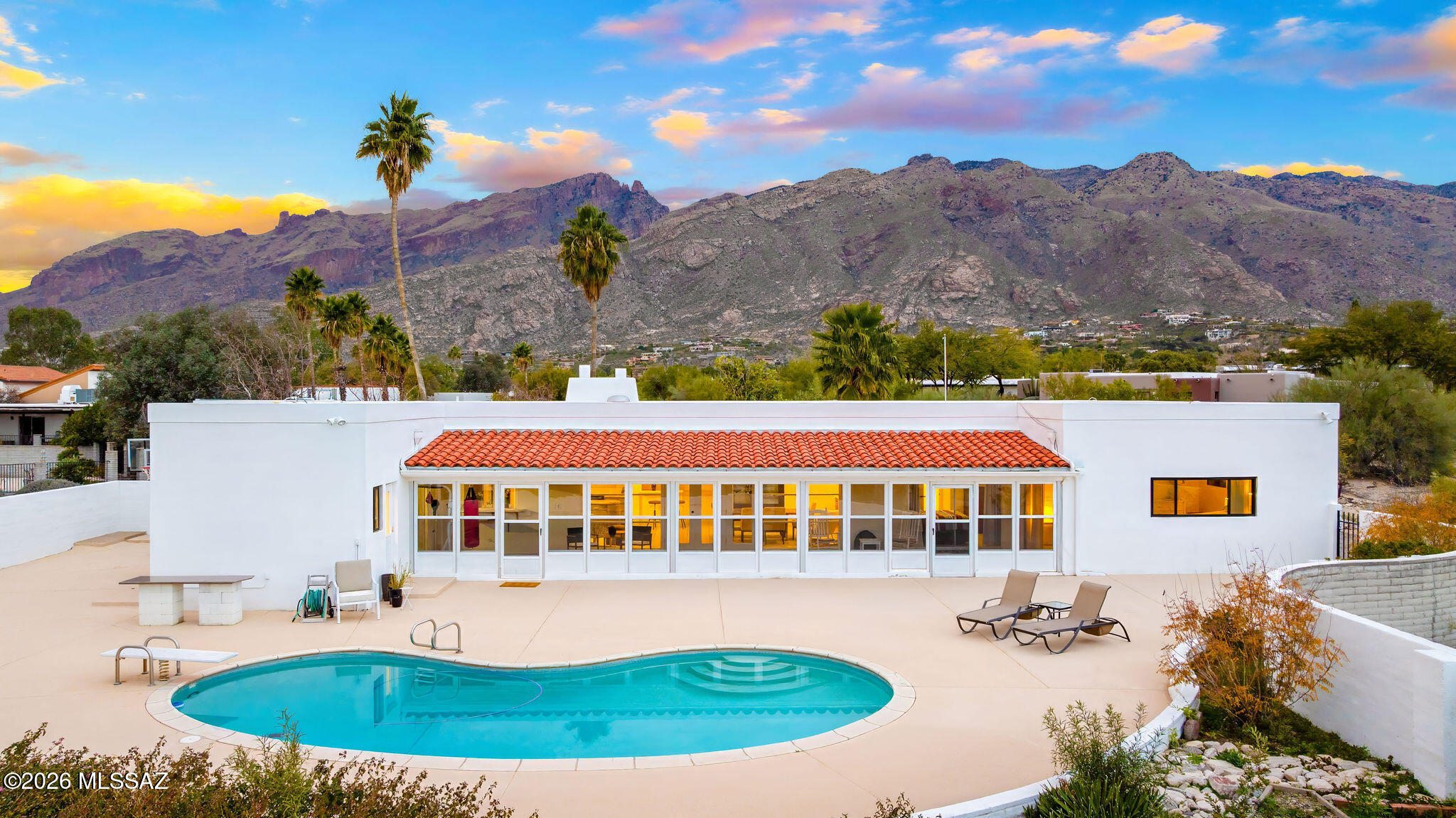 Unique opportunity for mid-century modern 4 bed/3 full bath, split floor plan, 3,631 SqFt home on massive 1.93 acre premium lot providing omnipresent Catalina mountain views in desirable Skyline Bel Air Estates, located in the vaunted Catalina Foothills school district in North Tucson. Enjoy the best of both worlds, the vintage character and charm of a single story (no stairs/no steps) 1970 masonry stucco Territorial home with 644 SqFt finished 2 car attached garage, 241 SqFt attached enclosed Arizona room, updated modern amenities, refreshing diving depth pool, sweeping city and panoramic Catalina mountain views. Enjoy multi-generation living with dual primary bedroom suites, each with a private ensuite bathroom. This thoughtfully improved residence offers a rare blend of significant