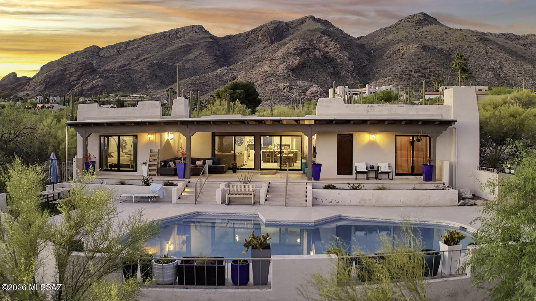 Located at the end of a quiet cul-de-sac on an elevated homesite within the prestigious, guard-gated Skyline Country Club Estates, this fully remodeled 1976, territorial-style residence showcases breathtaking, unobstructed 180-degree ''city lights to Mexico'' views across Tucson. A welcoming front courtyard sets the stage with new travertine flooring, built-in BBQ, banco seating, firepit, and stunning Catalina Mountain vista, an ideal space for relaxing or entertaining. Inside, the 2,378 sq. ft. great room floor plan offers 3 bedrooms and 3 baths, thoughtfully redesigned with new ceramic wood-plank flooring, exposed beamed ceilings, a charming beehive fireplace, and dramatic walls of glass framing the panoramic cityscape. The gourmet kitchen is both stylish and functional,