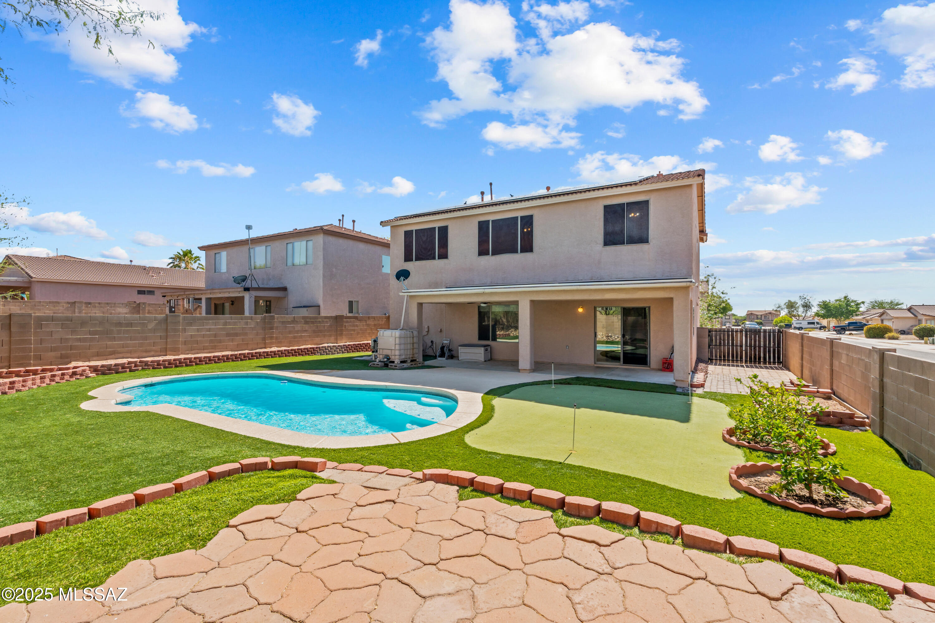 Beautiful 4-bedroom, 3.5-bath home on a large corner lot with only one side neighbor! Enjoy your backyard OASIS with a sparkling pool, putting green, faux lawn, extended covered patio, rainwater harvesting system, and stunning panoramic mountain views. Upstairs offers 4 spacious bedrooms, a loft, and 3 full baths. Downstairs features a welcoming foyer, flexible formal dining (great for an office or homeschool). Open kitchen with island breakfast bar, built-in desk, flows into the daily dining area, and a large great room. Wood laminate flooring throughout the main level (except for tile in kitchen and half-bath). Dual A/C units, solar screens, ceiling fans throughout, and a 3-car tandem garage. Leased Solar System! Located in the award-winning Vail School District!