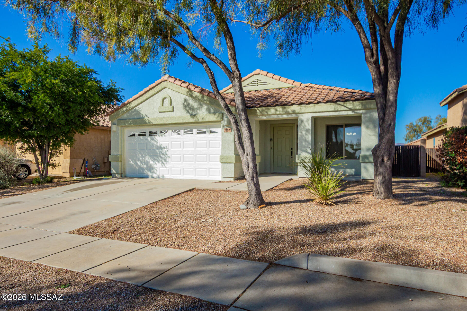 Move-in ready 4-bedroom home with 1,727 sq ft, tile flooring throughout, and fresh interior and exterior paint. Functional layout with spacious living areas. Kitchen opens to the family room and includes a breakfast bar, walk-in pantry, new stove and microwave, plus stainless refrigerator and dishwasher. The primary suite has dual vanities and tub/shower. Three additional bedrooms share a Jack-and-Jill bath. Newer HVAC and garage door. Block-fenced, pool-sized backyard with covered patio and low-maintenance yard. Seller will consider a concession toward buyer's closing costs with an acceptable offer. Seller/Owner is a licensed real estate agent.
