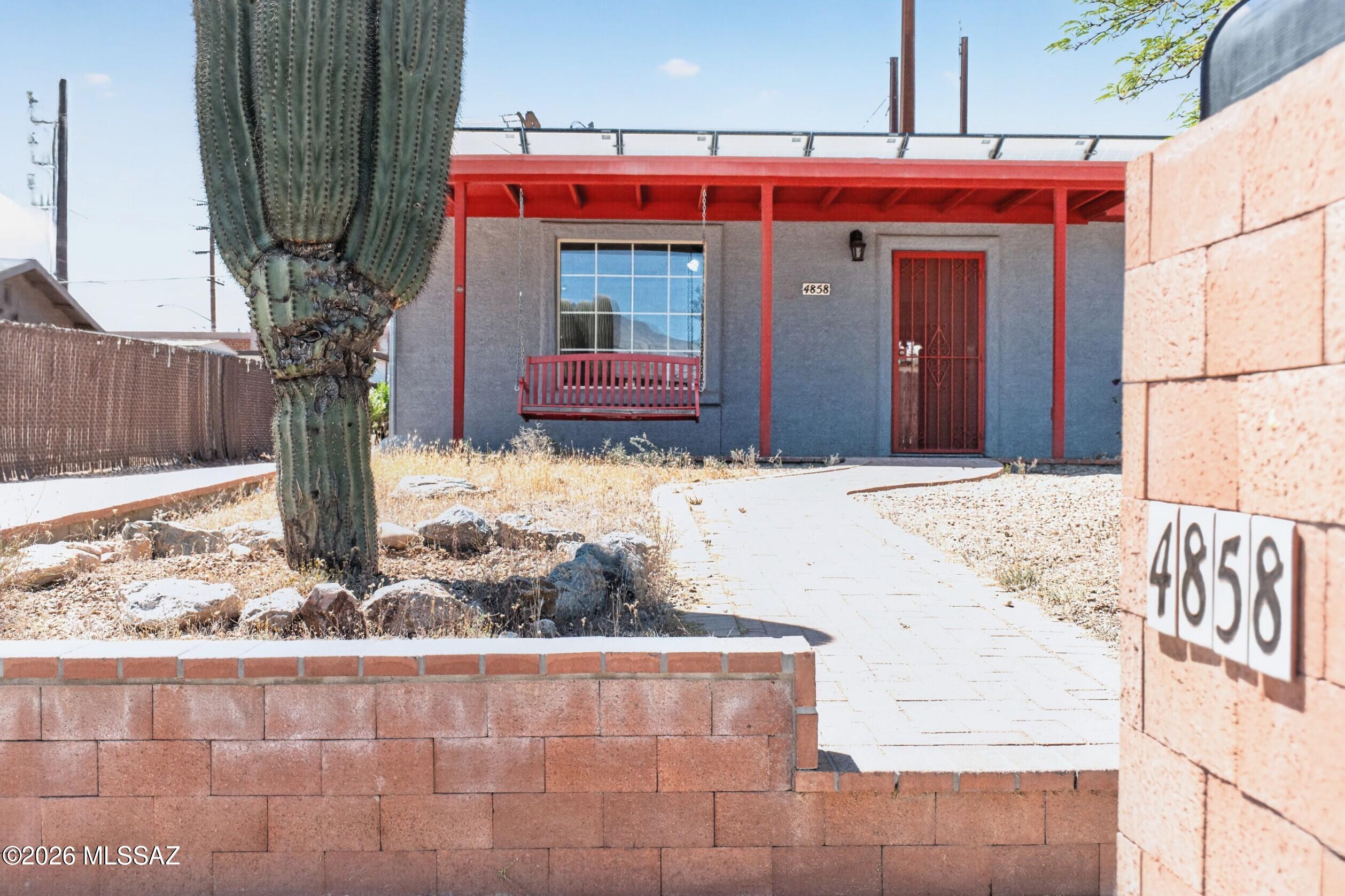Welcome home to this charming, upgraded ranch-style retreat in a sought-after Central Tucson neighborhood. A covered front porch with red wood beams, porch swing, and blooming bougainvillea creates a warm first impression. Inside offers 1,504 sq ft of single-story living with ceramic tile flooring, a floor-to-ceiling fireplace, and a bright neutral palette. The galley kitchen includes dishwasher, disposal, and refrigerator, opening to living and dining areas. A standout bonus room with private entry is ideal for guests, office, or rental use. Enjoy a covered patio with red beam accents and a built-in brick BBQ with stainless grill--perfect for relaxing or entertaining.