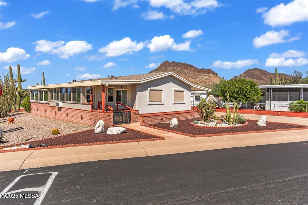 On a desirable corner lot, this charming home offers mountain views and a prime location directly across form the HOA facilities. Updated interior featuring newer windows that fill the space with natural light. The kitchen boasts modern cabinets, the hall bathroom is equipped with a walk-in tub. The primary suite offers a nice size with a wall of cabinets for abundant storage. Enjoy Arizona living year-round in the two separate heated and cooled Arizona rooms, perfect for relaxing or entertaining. The low-maintenance stucco exterior and two sheds- large enough for a golf cart garage. The property is part of a community with unlimited free golf and an impressive list of amenities, including two pools, a spa, a workout facility, shuffleboard, pickleball, tennis courts and you own the land.