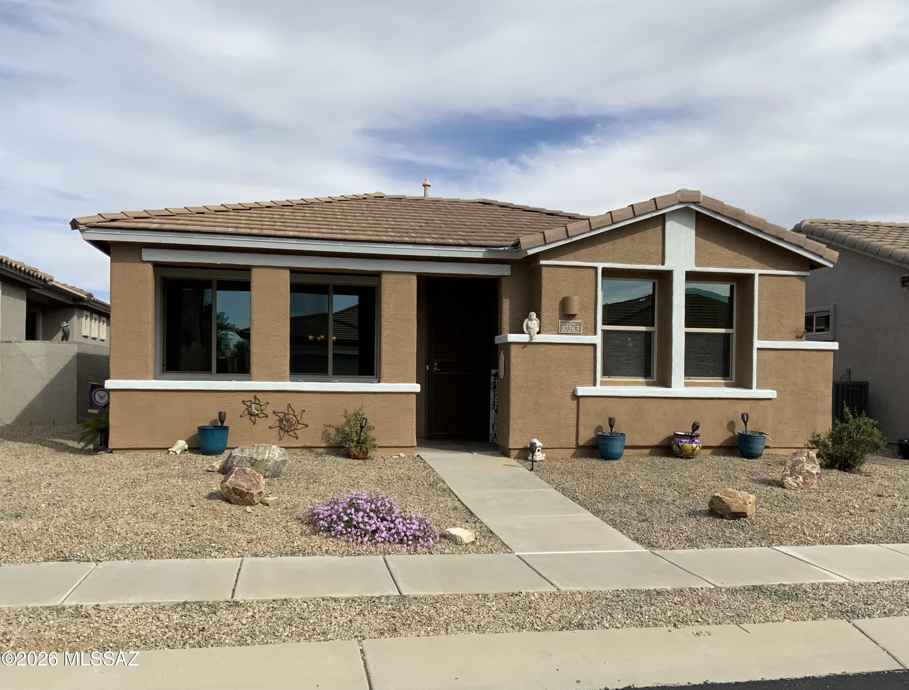 Charming home w/fully owned Solar in Del Webb at Rancho del Lago - an established active adult (55+) community located in the heart of Vail, AZ. Inviting front porch, Living Rm, 2 Bedrooms + Den, 2 full baths, tall ceilings and tiled floors. Extended kitchen cabinets, granite counters, refrigerator, gas range, newer MW & DW, XL deep sink, rollouts. Tankless H/W. Laundry Rm, washer & dryer. Courtyard patio off kitchen with 2 gates. Garage has overhead storage. Rear garage entry from White Surrey Dr. Enjoy community amentiies and activities including: Swimming, spa, fitness, pickleball, tennis, bocce, classes, walking paths, and more! Del Webb is adjacent to Del Lago golf, close to grocery & conveniences. You can't miss the nearby Rincon Mountains...they always put on a show!