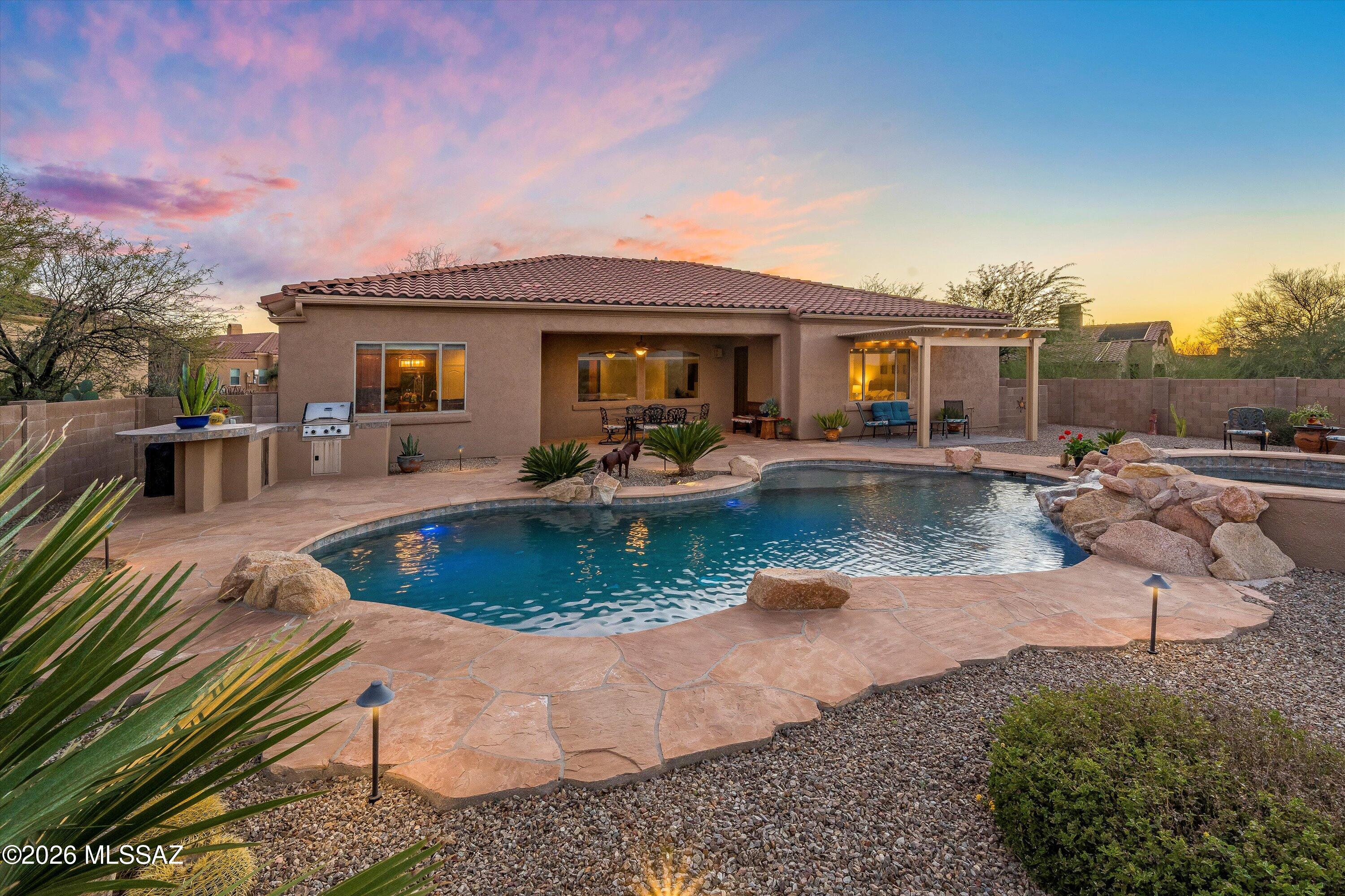 Experience refined desert living in this beautifully maintained home featuring spacious living areas with timeless travertine flooring. The standout backyard is designed for both relaxation and entertaining, complete with a solar-heated pool, spa, a horseshoe pit and expansive patio space perfect for enjoying Arizona's stunning weather.Backing to state land, the property offers added privacy along with breathtaking mountain views and unforgettable sunsets. The seamless blend of indoor comfort and outdoor beauty creates an inviting atmosphere ideal for everyday living or hosting guests. Conveniently located near local amenities and within the award winning Vail School District, this home provides a peaceful desert setting for the lifestyle many are seeking.