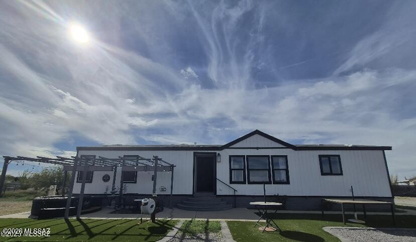 This immaculate affixed manufacture home sits on 1 acre of land with privacy fencing on entire home.This home offers new exterior paint,separate garage barn shed,car port,exterior carport shed has also been painted.Outdoor ameneties include RV hook up,extended patio with pavers,artificial grass,2 patio Gazebo,chicken coop,green house, also installed. Fruit trees planted 2 pomegranates,1 fig,1 peach,1 apricot tree.Complete interior has new paint,new wood laminate throughout the whole home.Kitchen includes new quartz countertops,backsplash tile,wine fridge,and new faucet.Brand new appliances include refrigerator and LG Thin Q washer and dryer.New hardware in all restrooms.Must see!Call to schedule your showing. Home is selling AS-IS.